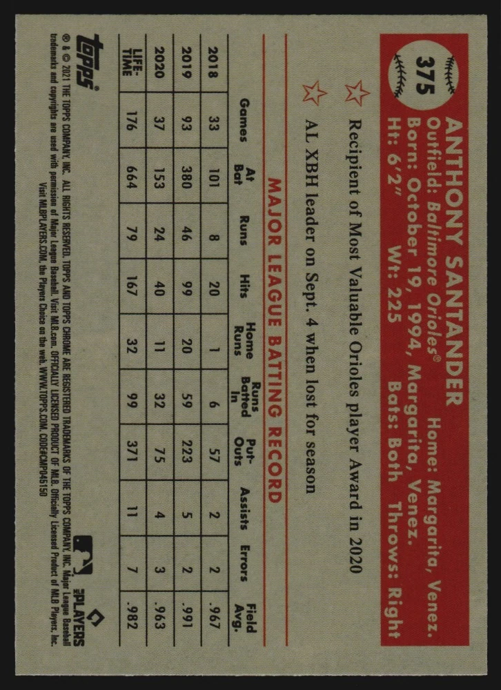 2021 Topps Chrome Platinum Anniversary Baseball Card #375 Anthony Santander Front Back Sport: Baseball Set: 2021 Topps Chrome Platinum Anniversary Year: 2021 Item#: 375 Player: Anthony Santander Team: Baltimore Orioles Brand: Topps Chrome Platinum Anniversar Manufacturer: Topps Co. Grading Company: Raw Grade SetType: Main Item Condition: Near Mint/Mint 2014 Beckett Collectibles, LLC. All Rights Reserved Powered by: Thank you for choosing Burbank Sportscards, the sports cards superstore. We offer a large selection of singles across all sports. Visit our ebay store to view all our items available. Our Shipping Policy We offer Free Standard Shipping to all Domestic customers. Options for Expedited shipping are also available at checkout. For our international customers, shipping is $9.99 for the first item, and $0.25 for each additional item. Note to all customers: To qualify for combines shipping, we ask our customers to add items into the shopping cart. Please note, we do not combine orders that are placed separately. Our Service: Generally, our turnaround is super quick as we process and send out orders same day payment is received. Stock Availability: We do our best to ensure all items are in stock; however, in case of the rare stock out, the customer will have the option for a replacement card, or we will process a refund so the order is not held up. Our Images: Many of our images are stock photos from Beckett archives. They are a representation of the actual card you would receive. If you have any questions regarding the item you're interested in, please feel free to ask (serial numbers and relic pieces may vary) Moreover, in a case of a wrong or defective photo, please notify us, so we can adjust it. Other FAQ's: -When buying multiple cards, do you top load each item? No; however, we do try to insure all items are shipped securely. If you wish to have all of your cards top loaded it is a paid service and can be arranged. Please email for more details. For other questions, please feel free to ask. Thank you.