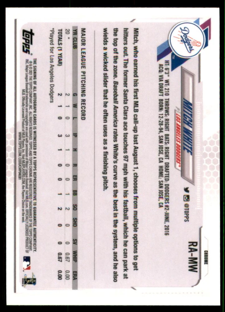 2021 Topps Chrome Rookie Autographs #RAMW Mitch White Front Back Sport: Baseball Set: 2021 Topps Chrome Rookie Autographs Year: 2021 Item#: RAMW Player: Mitchell White Team: Los Angeles Dodgers Attributes: Autograph Brand: Topps Chrome Manufacturer: Topps Co. Grading Company: Raw Grade SetType: Insert Item Condition: Near Mint/Mint 2014 Beckett Collectibles, LLC. All Rights Reserved Powered by: Thank you for choosing Burbank Sportscards, the sports cards superstore. We offer a large selection of singles across all sports. Visit our ebay store to view all our items available. Our Shipping Policy We offer Free Standard Shipping to all Domestic customers. Options for Expedited shipping are also available at checkout. For our international customers, shipping is $9.99 for the first item, and $0.25 for each additional item. Note to all customers: To qualify for combines shipping, we ask our customers to add items into the shopping cart. Please note, we do not combine orders that are placed separately. Our Service: Generally, our turnaround is super quick as we process and send out orders same day payment is received. Stock Availability: We do our best to ensure all items are in stock; however, in case of the rare stock out, the customer will have the option for a replacement card, or we will process a refund so the order is not held up. Our Images: Many of our images are stock photos from Beckett archives. They are a representation of the actual card you would receive. If you have any questions regarding the item you're interested in, please feel free to ask (serial numbers and relic pieces may vary) Moreover, in a case of a wrong or defective photo, please notify us, so we can adjust it. Other FAQ's: -When buying multiple cards, do you top load each item? No; however, we do try to insure all items are shipped securely. If you wish to have all of your cards top loaded it is a paid service and can be arranged. Please email for more details. For other questions, please feel free to ask. Thank you.