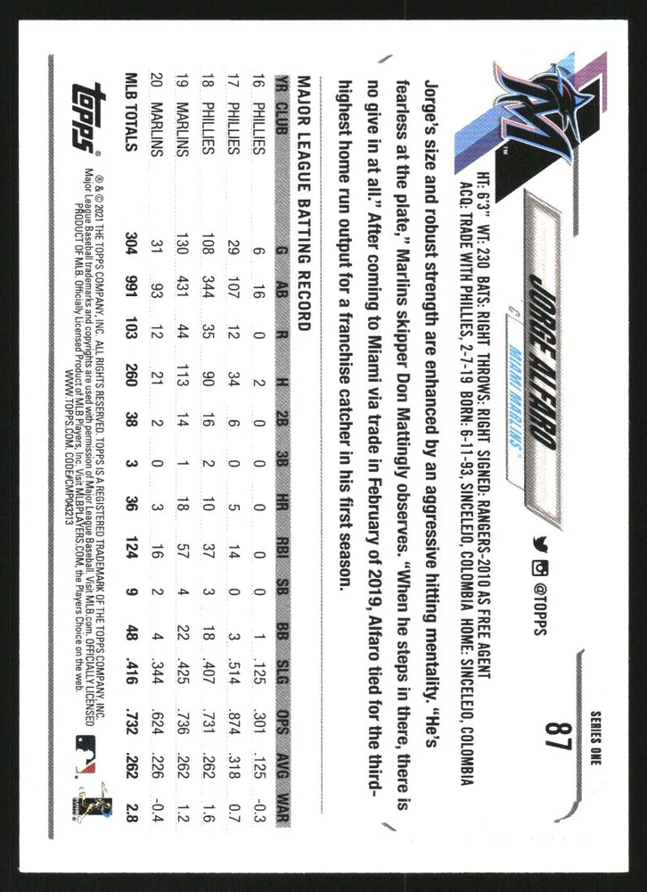 2021 Topps Gold Foil #87 Jorge Alfaro Front Back Sport: Baseball Set: 2021 Topps Gold Foil Year: 2021 Item#: 87 Player: Jorge Alfaro Team: Miami Marlins Brand: Topps Manufacturer: Topps Co. Grading Company: Raw Grade SetType: Parallel Item Condition: Near Mint/Mint 2014 Beckett Collectibles, LLC. All Rights Reserved Powered by: Thank you for choosing Burbank Sportscards, the sports cards superstore. We offer a large selection of singles across all sports. Visit our ebay store to view all our items available. Our Shipping Policy We offer Free Standard Shipping to all Domestic customers. Options for Expedited shipping are also available at checkout. For our international customers, shipping is $9.99 for the first item, and $0.25 for each additional item. Note to all customers: To qualify for combines shipping, we ask our customers to add items into the shopping cart. Please note, we do not combine orders that are placed separately. Our Service: Generally, our turnaround is super quick as we process and send out orders same day payment is received. Stock Availability: We do our best to ensure all items are in stock; however, in case of the rare stock out, the customer will have the option for a replacement card, or we will process a refund so the order is not held up. Our Images: Many of our images are stock photos from Beckett archives. They are a representation of the actual card you would receive. If you have any questions regarding the item you're interested in, please feel free to ask (serial numbers and relic pieces may vary) Moreover, in a case of a wrong or defective photo, please notify us, so we can adjust it. Other FAQ's: -When buying multiple cards, do you top load each item? No; however, we do try to insure all items are shipped securely. If you wish to have all of your cards top loaded it is a paid service and can be arranged. Please email for more details. For other questions, please feel free to ask. Thank you.