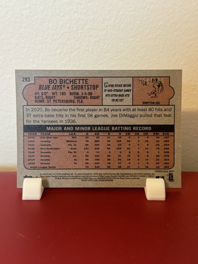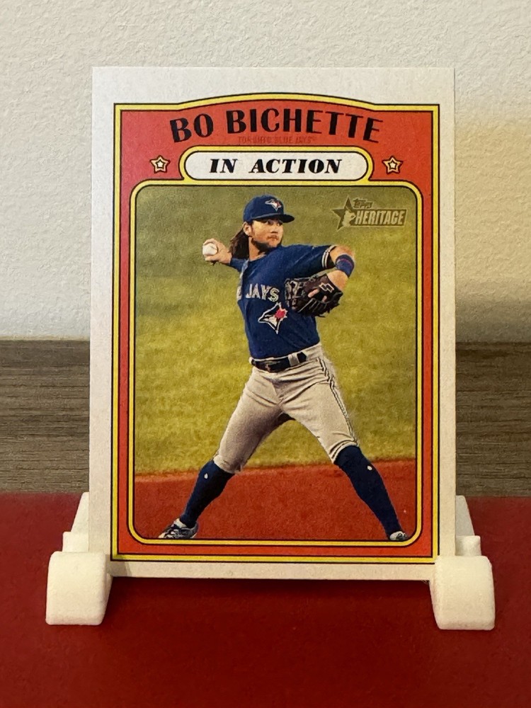 Elevate your Toronto Blue Jays collection with this lot of 3 2021 Topps Heritage cards, featuring the talented Bo Bichette. The set includes a striking refractor card numbered to 999, adding a layer of exclusivity and visual appeal to your assortment. Complementing the refractor, you'll also find 2 classic base cards, ensuring you capture both the essence of the player and the nostalgia of the sport. Crafted with care in the United States, each card is produced with quality card stock, designed to withstand the test of time. These cards are a testament to Bo Bichette's skill on the field during the 2021 MLB season, capturing the spirit of the game and the excitement of the World Series event. Add these original, authentically licensed Topps cards to your collection today.