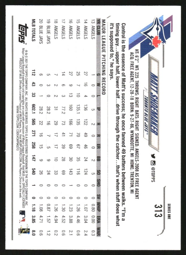 2021 Topps Rainbow Foil #313 Matt Shoemaker Front Back Sport: Baseball Set: 2021 Topps Rainbow Foil Year: 2021 Item#: 313 Player: Matt Shoemaker Team: Toronto Blue Jays Brand: Topps Manufacturer: Topps Co. Grading Company: Raw Grade SetType: Parallel Item Condition: Near Mint/Mint 2014 Beckett Collectibles, LLC. All Rights Reserved Powered by: Thank you for choosing Burbank Sportscards, the sports cards superstore. We offer a large selection of singles across all sports. Visit our ebay store to view all our items available. Our Shipping Policy We offer Free Standard Shipping to all Domestic customers. Options for Expedited shipping are also available at checkout. For our international customers, shipping is $9.99 for the first item, and $0.25 for each additional item. Note to all customers: To qualify for combines shipping, we ask our customers to add items into the shopping cart. Please note, we do not combine orders that are placed separately. Our Service: Generally, our turnaround is super quick as we process and send out orders same day payment is received. Stock Availability: We do our best to ensure all items are in stock; however, in case of the rare stock out, the customer will have the option for a replacement card, or we will process a refund so the order is not held up. Our Images: Many of our images are stock photos from Beckett archives. They are a representation of the actual card you would receive. If you have any questions regarding the item you're interested in, please feel free to ask (serial numbers and relic pieces may vary) Moreover, in a case of a wrong or defective photo, please notify us, so we can adjust it. Other FAQ's: -When buying multiple cards, do you top load each item? No; however, we do try to insure all items are shipped securely. If you wish to have all of your cards top loaded it is a paid service and can be arranged. Please email for more details. For other questions, please feel free to ask. Thank you.