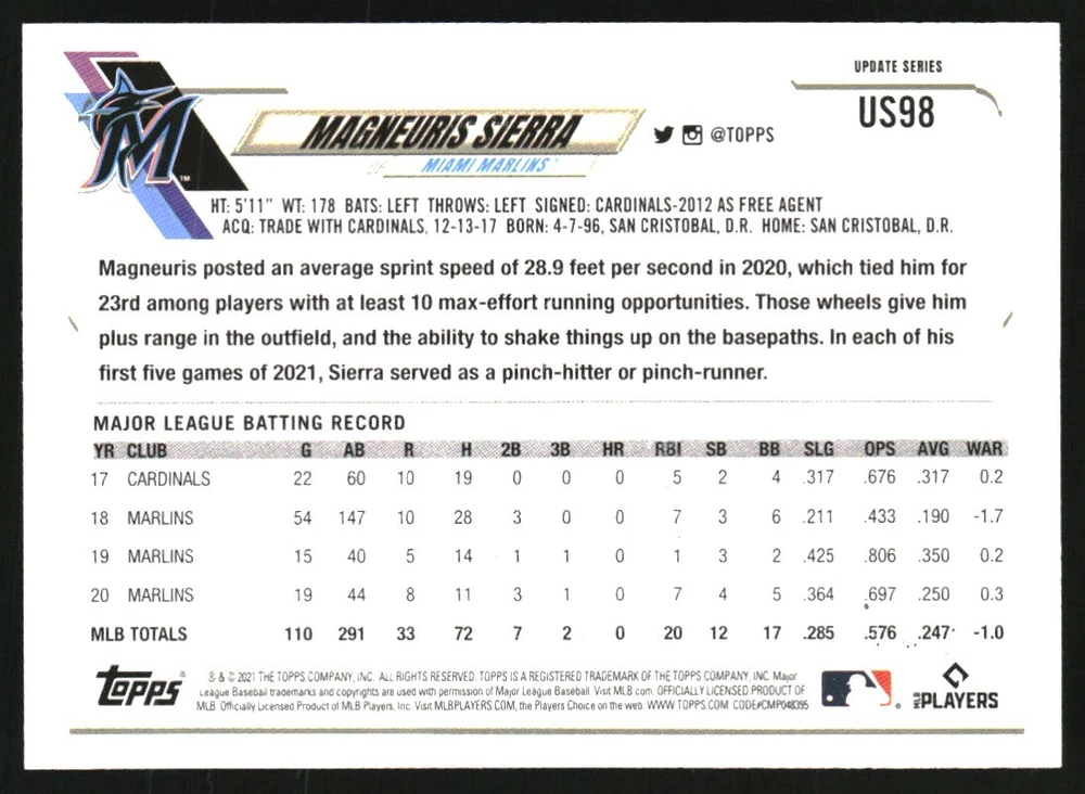 2021 Topps Update Gold Foil #US98 Magneuris Sierra Front Back Sport: Baseball Set: 2021 Topps Update Gold Foil Year: 2021 Item#: US98 Player: Magneuris Sierra Team: Miami Marlins Brand: Topps Update Manufacturer: Topps Co. Grading Company: Raw Grade SetType: Parallel Item Condition: Near Mint/Mint 2014 Beckett Collectibles, LLC. All Rights Reserved Powered by: Thank you for choosing Burbank Sportscards, the sports cards superstore. We offer a large selection of singles across all sports. Visit our ebay store to view all our items available. Our Shipping Policy We offer Free Standard Shipping to all Domestic customers. Options for Expedited shipping are also available at checkout. For our international customers, shipping is $9.99 for the first item, and $0.25 for each additional item. Note to all customers: To qualify for combines shipping, we ask our customers to add items into the shopping cart. Please note, we do not combine orders that are placed separately. Our Service: Generally, our turnaround is super quick as we process and send out orders same day payment is received. Stock Availability: We do our best to ensure all items are in stock; however, in case of the rare stock out, the customer will have the option for a replacement card, or we will process a refund so the order is not held up. Our Images: Many of our images are stock photos from Beckett archives. They are a representation of the actual card you would receive. If you have any questions regarding the item you're interested in, please feel free to ask (serial numbers and relic pieces may vary) Moreover, in a case of a wrong or defective photo, please notify us, so we can adjust it. Other FAQ's: -When buying multiple cards, do you top load each item? No; however, we do try to insure all items are shipped securely. If you wish to have all of your cards top loaded it is a paid service and can be arranged. Please email for more details. For other questions, please feel free to ask. Thank you.