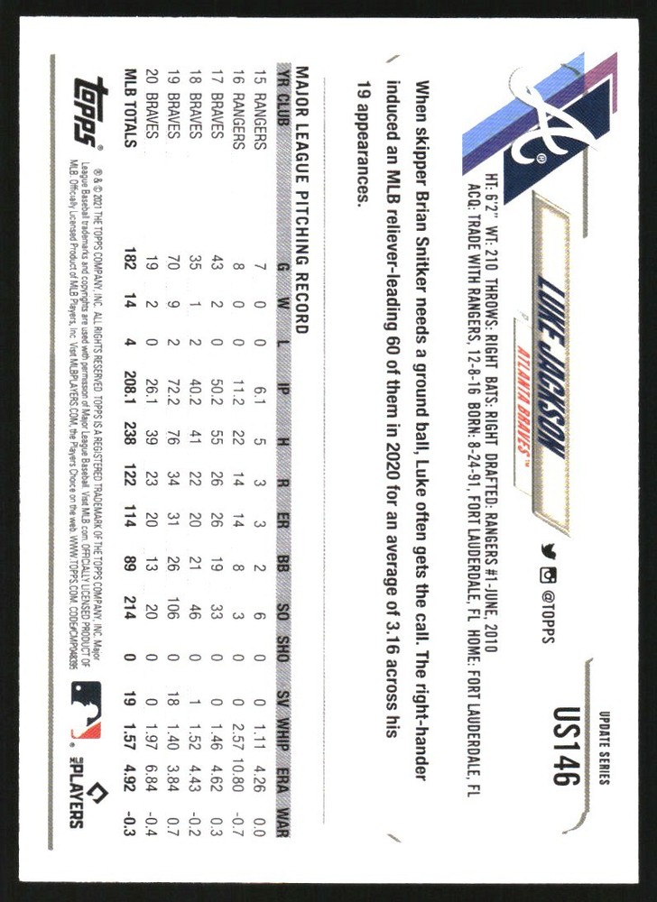 2021 Topps Update Rainbow Foil #US146 Luke Jackson Front Back Sport: Baseball Set: 2021 Topps Update Rainbow Foil Year: 2021 Item#: US146 Player: Luke Jackson Team: Atlanta Braves Brand: Topps Update Manufacturer: Topps Co. Grading Company: Raw Grade SetType: Parallel Item Condition: Near Mint/Mint 2014 Beckett Collectibles, LLC. All Rights Reserved Powered by: Thank you for choosing Burbank Sportscards, the sports cards superstore. We offer a large selection of singles across all sports. Visit our ebay store to view all our items available. Our Shipping Policy We offer Free Standard Shipping to all Domestic customers. Options for Expedited shipping are also available at checkout. For our international customers, shipping is $9.99 for the first item, and $0.25 for each additional item. Note to all customers: To qualify for combines shipping, we ask our customers to add items into the shopping cart. Please note, we do not combine orders that are placed separately. Our Service: Generally, our turnaround is super quick as we process and send out orders same day payment is received. Stock Availability: We do our best to ensure all items are in stock; however, in case of the rare stock out, the customer will have the option for a replacement card, or we will process a refund so the order is not held up. Our Images: Many of our images are stock photos from Beckett archives. They are a representation of the actual card you would receive. If you have any questions regarding the item you're interested in, please feel free to ask (serial numbers and relic pieces may vary) Moreover, in a case of a wrong or defective photo, please notify us, so we can adjust it. Other FAQ's: -When buying multiple cards, do you top load each item? No; however, we do try to insure all items are shipped securely. If you wish to have all of your cards top loaded it is a paid service and can be arranged. Please email for more details. For other questions, please feel free to ask. Thank you.