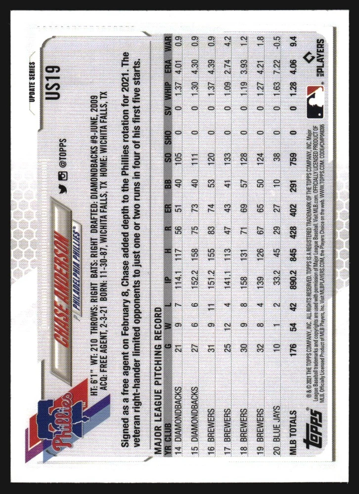 2021 Topps Update Rainbow Foil #US19 Chase Anderson Front Back Sport: Baseball Set: 2021 Topps Update Rainbow Foil Year: 2021 Item#: US19 Player: Chase Anderson Team: Philadelphia Phillies Brand: Topps Update Manufacturer: Topps Co. Grading Company: Raw Grade SetType: Parallel Item Condition: Near Mint/Mint 2014 Beckett Collectibles, LLC. All Rights Reserved Powered by: Thank you for choosing Burbank Sportscards, the sports cards superstore. We offer a large selection of singles across all sports. Visit our ebay store to view all our items available. Our Shipping Policy We offer Free Standard Shipping to all Domestic customers. Options for Expedited shipping are also available at checkout. For our international customers, shipping is $9.99 for the first item, and $0.25 for each additional item. Note to all customers: To qualify for combines shipping, we ask our customers to add items into the shopping cart. Please note, we do not combine orders that are placed separately. Our Service: Generally, our turnaround is super quick as we process and send out orders same day payment is received. Stock Availability: We do our best to ensure all items are in stock; however, in case of the rare stock out, the customer will have the option for a replacement card, or we will process a refund so the order is not held up. Our Images: Many of our images are stock photos from Beckett archives. They are a representation of the actual card you would receive. If you have any questions regarding the item you're interested in, please feel free to ask (serial numbers and relic pieces may vary) Moreover, in a case of a wrong or defective photo, please notify us, so we can adjust it. Other FAQ's: -When buying multiple cards, do you top load each item? No; however, we do try to insure all items are shipped securely. If you wish to have all of your cards top loaded it is a paid service and can be arranged. Please email for more details. For other questions, please feel free to ask. Thank you.