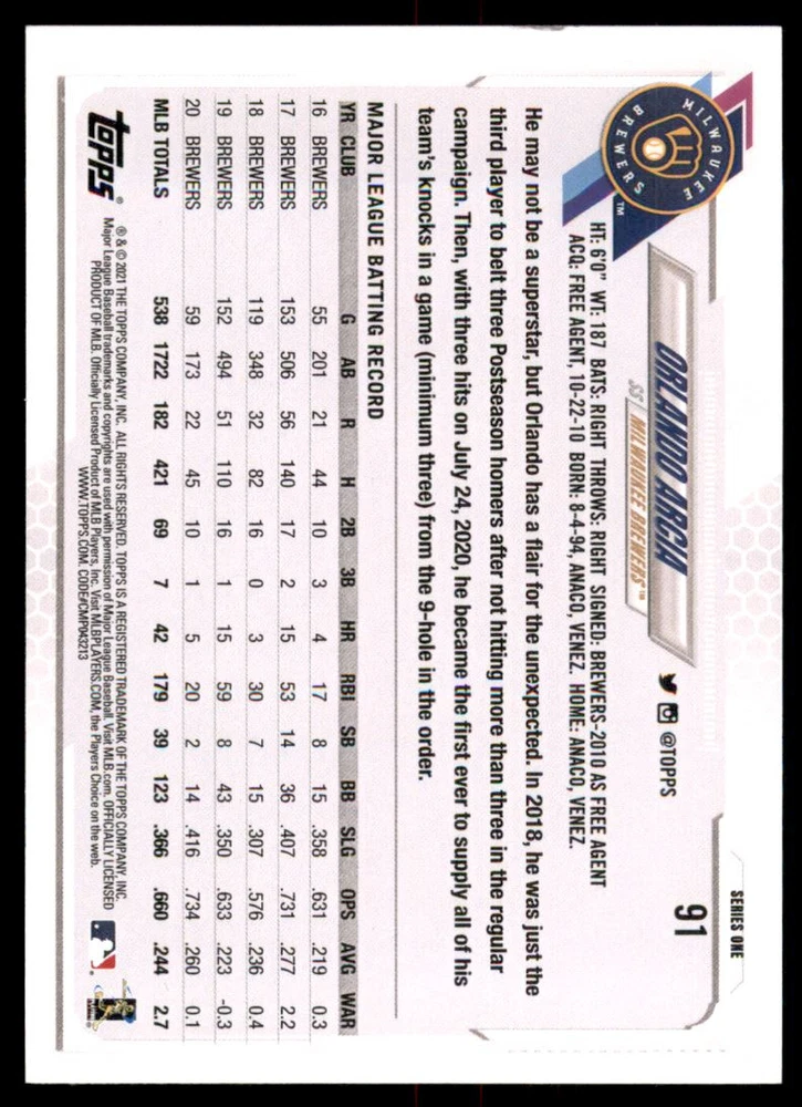 2021 Topps Walmart Royal Blue #91 Orlando Arcia Front Back Sport: Baseball Set: 2021 Topps Walmart Royal Blue Year: 2021 Item#: 91 Player: Orlando Arcia Team: Milwaukee Brewers Brand: Topps Manufacturer: Topps Co. Grading Company: Raw Grade SetType: Parallel Item Condition: Near Mint/Mint 2014 Beckett Collectibles, LLC. All Rights Reserved Powered by: Thank you for choosing Burbank Sportscards, the sports cards superstore. We offer a large selection of singles across all sports. Visit our ebay store to view all our items available. Our Shipping Policy We offer Free Standard Shipping to all Domestic customers. Options for Expedited shipping are also available at checkout. For our international customers, shipping is $9.99 for the first item, and $0.25 for each additional item. Note to all customers: To qualify for combines shipping, we ask our customers to add items into the shopping cart. Please note, we do not combine orders that are placed separately. Our Service: Generally, our turnaround is super quick as we process and send out orders same day payment is received. Stock Availability: We do our best to ensure all items are in stock; however, in case of the rare stock out, the customer will have the option for a replacement card, or we will process a refund so the order is not held up. Our Images: Many of our images are stock photos from Beckett archives. They are a representation of the actual card you would receive. If you have any questions regarding the item you're interested in, please feel free to ask (serial numbers and relic pieces may vary) Moreover, in a case of a wrong or defective photo, please notify us, so we can adjust it. Other FAQ's: -When buying multiple cards, do you top load each item? No; however, we do try to insure all items are shipped securely. If you wish to have all of your cards top loaded it is a paid service and can be arranged. Please email for more details. For other questions, please feel free to ask. Thank you.