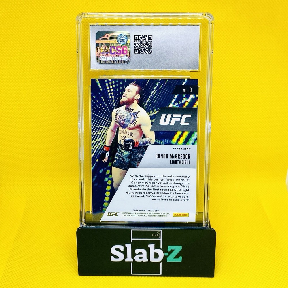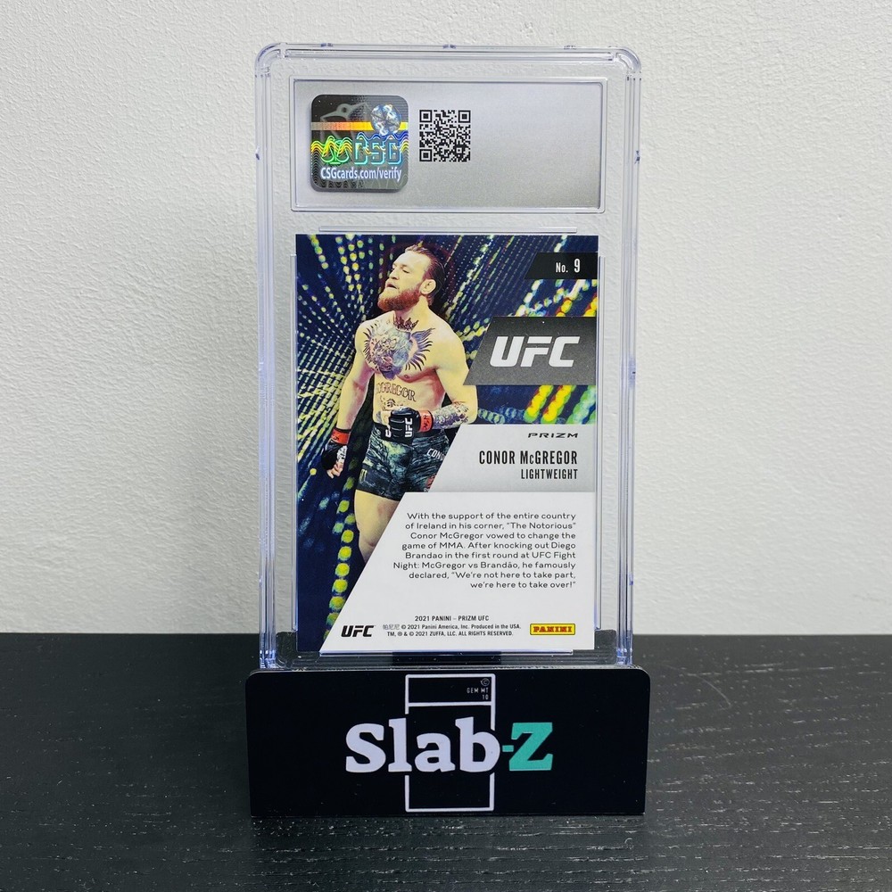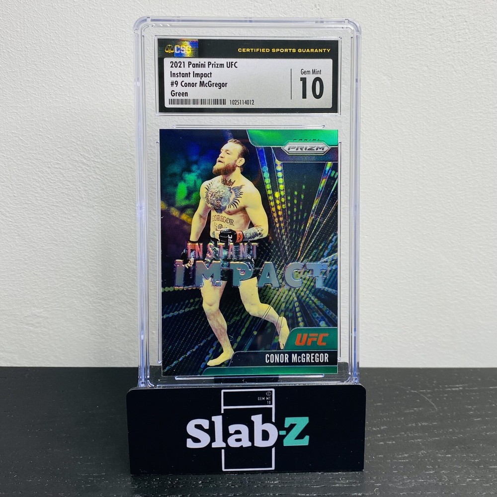 Own a piece of history with this 2021 Panini Prizm UFC trading card featuring Conor McGregor. This sports trading card is graded CGS 10 for its gem mint condition and is a must-have for any MMA or UFC fan. The card is part of the Instant Impact GREEN PRIZM parallel/variety set, and features McGregor in his iconic fighting stance. This card is a great addition to any sports trading card collection and is perfect for displaying or trading. Don't miss out on the chance to own a piece of UFC history with this 2021 Panini Prizm UFC trading card. **Buy multiple items, and save money with our FREE COMBINED SHIPPING (info below!) ** PACKAGING This graded card is sleeved within a teambag and surrounded by cardboard/bubbles, and will be sent in a padded letter (17x13x3cm). US DOMESTIC & INTERNATIONAL SHIPPING Hong Kong Post office/e-Express service that offers a fast and affordable full tracking solution with eBay, for reliable dispatch of commodities to customers with insurance, anywhere in the world. Estimated US & International delivery time is 5-10 working day(s ELECTRONIC CUSTOM DECLARATION FOR INTERNATIONAL SENDING For any international sending (please see extended list below), we will prepare electronic custom declaration containing: - Number of items - Custom declaration: each item will be declared as “Sales of Good” with the price paid by the sender (be aware from your country side if any tax applies, however most countries in the world do not charge duties on trading cards, like US/EU/UK etc). FREE COMBINED SHIPPING UP TO 4 ADDITIONAL RAW CARDS After you buy one graded card, you can add up to 4 additional RAW CARDS and get free combined shipping for those: PLEASE CLICK ON "Request Total" in your Shopping Cart BEFORE PROCESSING YOUR PAYMENT. We will send you the revised invoice with the discounted shipping cost for your approval. When you buy one GRADED card, you can add up to 4 more RAW cards to get FREE COMBINED shipping. From the 6th card in the same order, we will charge USD0.50 for each additional raw card. And for each additional graded card, we will charge USD6 per graded card. CARDS CONDITION The item shown is the exact item you will receive! Please see the provided picture(s) before buying/bidding. We ALWAYS mention in title and description if there is any visible/major flaw. However we care to select and provide the best condition cards to our collectors, we are not a grading company. For our non graded items, we do not ensure any grading due to minor/factory flaws (macro/print marks, soft corners/edges/out centred, etc). For our graded items, some cases might have external/minor dents, scratches we are not responsible for. —-------------------------------------- List of Destinations Requiring Submission of Electronic Customs Declaration sending all mail items containing goods: Continent Destination Asia Jordan, Korea and the Mainland Central and South America Brazil Europe^ Austria, Belgium, Bulgaria, Croatia, Cyprus, Czech Republic, Denmark, Estonia, Finland, France, Germany, Greece, Hungary, Ireland, Italy, Latvia, Lithuania, Luxembourg, Malta, Netherlands, Norway, Poland, Portugal, Romania, Slovakia, Slovenia, Spain, Sweden, Switzerland and the United Kingdom North America Puerto Rico*, the United States of America and Virgin Islands of the United States of America* Oceania Australia, Caroline Islands*, Guam*, Marina Islands (Northern)*, Marshall Islands*, Micronesia*, Palau*, Samoa (the United States of America Territory)* and Wake Island* ** FOLLOW US ON EBAY OR INSTAGRAM (@slabzcollectable) TO RECEIVE OUR SPECIAL PROMOTIONS!**