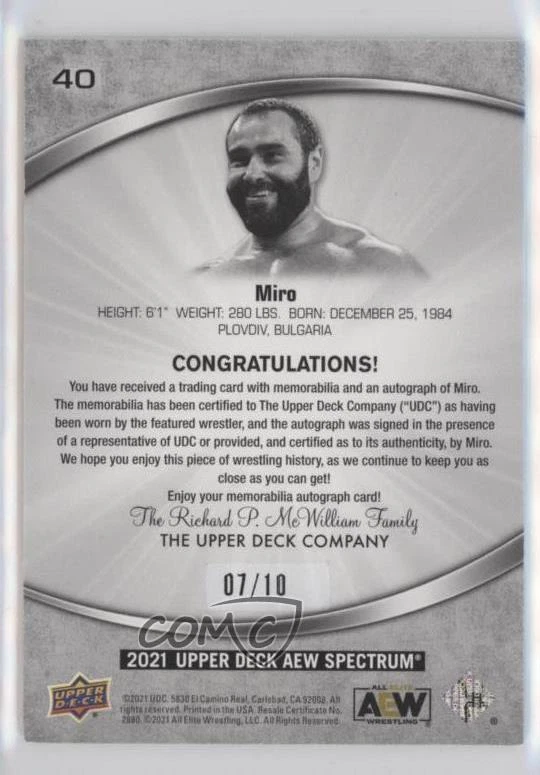 2021 Upper Deck AEW Spectrum - [Base] - Dark Memorabilia Autographs #40 Miro Qty Made: 10 - RC (Rookie Card) - Wrestling Card - Featuring Miro Search for more: 2021 Upper Deck AEW Spectrum Search for more: 2021 Upper Deck AEW Spectrum - [Base] - Dark Memorabilia Autographs View all of our Listings Auctions Buy It Now About Us Located in the beautiful Pacific Northwest, COMC (Check Out My Cards) is the world's largest consignment service for trading card singles. More than 10,000 people have used our consignment service to list over 50 million trading cards. We currently house 20 million cards, each listed for sale with front and back images of the actual card. Find out how we can help you consign your items on eBay by contacting us through eBay messaging. COMC -- "The Safe & Easy Way to Buy & Sell" Representative Image - Select Specific Item above to see image of actual item Representative Image - Select Specific Item above to see image of actual item Raw Condition for Modern Cards Unless otherwise noted, raw modern cards are listed in Near Mint-Mint condition or better. A NM-MT card appears to be Mint at first glance, but upon closer inspection, may exhibit some of the following: minor print defects (e.g. roller marks, print line, dimple), minor scratches, slight edge wear, and slight corner wear. Centering is clearly visible in the images provided and does not factor into our condition assessment. Raw Condition for Vintage Cards Unless otherwise noted, raw vintage cards are listed in Excellent condition or better. An EX card may exhibit some of the following: minor rounding of corners, surface wear, print defects, light scratches, and slight edge wear/chipping. Centering is clearly visible in the images provided and does not factor into our condition assessment. Domestic Shipping Combined shipping for multiple items is available. To receive combined shipping, please ensure all desired items are in your eBay shopping cart before proceeding to checkout. eBay limits orders to 40 items per order. We automatically combine multiple orders placed on the same day. If you place multiple orders on the same day, please contact us to request a refund of applicable shipping costs. Signature confirmation may be required on invoices over $400. Raw cards are shipped in toploaders. International Shipping COMC offers eBay's International Shipping (EIS) for international orders under $2,500* (see country exceptions below). All duties and import fees are paid at checkout; in the rare event that there are additional import fees upon delivery, these are borne by the buyer. EIS packages route through a shipping hub in Erlanger, KY before shipping to their final destination. Please note that EIS does not allow for combined shipments. The shipping rates are determined by eBay and cannot be adjusted. *Maximum sale price exceptions: Colombia, Kuwait ($2,000); Taiwan ($1,539); Chile, Costa Rica, Guatemala, Honduras, Trinidad and Tobago ($1,000); Antigua and Barbuda, Aruba, Belize, Dominica, Grenada, Philippines, Saint Kitts and Nevis, Saint Lucia, Montserrat, Turks and Caicos Islands ($500); Dominican Republic, El Salvador ($200). Please request a shipping quote through eBay messaging for orders that exceed the maximum sale price supported by eBay's International Shipping. You will be responsible for all duties and import fees for international orders shipped outside the EIS. Raw cards are shipped in toploaders. Payment COMC does not accept offers on our cards through our eBay storefront. COMC utilizes eBay’s managed payments system. If you are experiencing difficulties making a payment, please contact eBay for assistance. Return Policy Returns are only accepted on the rare occasion the item is not as described. If you are making a return, please initiate the return process through eBay so a mailing label can be provided for you. Prior to listing, our expert team carefully assessed this item to represent it accurately. Please review the description and high-definition images prior to purchasing to ensure this item meets your satisfaction. We welcome you to contact us if you have further questions about this item. Trust and Integrity COMC carefully assesses each item consigned to us to prevent fraudulent items from entering the marketplace. If you believe an item offered on COMC may be fraudulent, please contact us with details so we can investigate the issue. Items we determine are outside our supported items policy may be removed. Last Modified: 12/2/2024 1:48:19 AM PDT