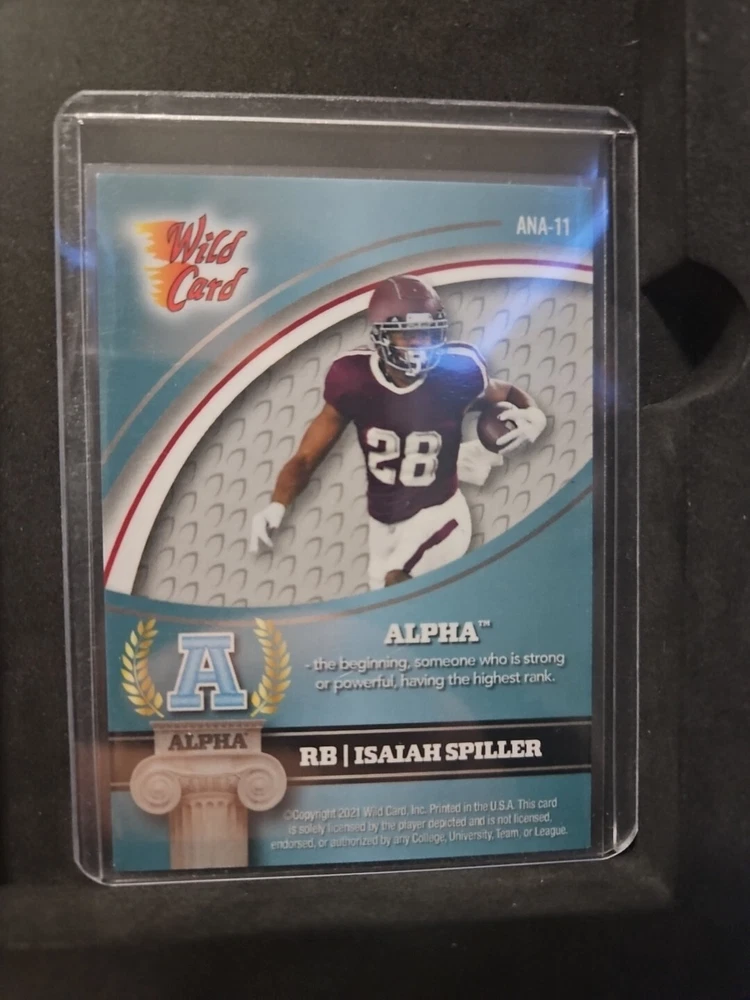 The 2021 Wild Card Alumination #ANA-11 trading card features rookie player Isaiah Spiller from the Texas A&M Aggies football team. This ungraded card is part of a set limited to 75 copies, with this particular card being number 50 out of 75. The card is not autographed and is in near mint or better condition. Produced by Wild Card, this sports trading card is a part of the 2021 season collection in the National Collegiate Athletic Association (NCAA) league.