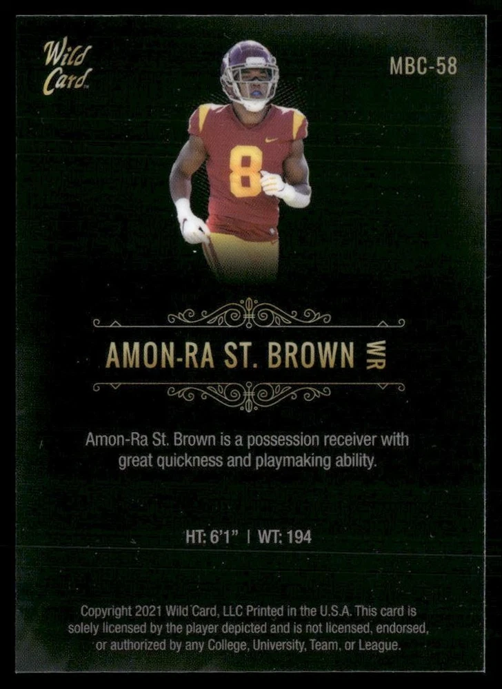 About Me Other Listings Feedback Add to Favorites Contact Me eBay Store JEm_Mint_Trading 2021 Wild Card Matte Black Premier Rookie Amon-Ra St. Brown Rookie USC Trojans No stock photo / These are real scans or pictures Details Description: Amon-Ra St. Brown Category: Football Year: 2021 Product: Wild Card Matte Black Premier Rookie Team: USC Trojans Card Number: MBC-58 Rookie: Yes Dimensions: 3½" x 2½" SKU: FT A0004 R02 I (27) Listing By Kronocard trading cards software v2.8.1.2