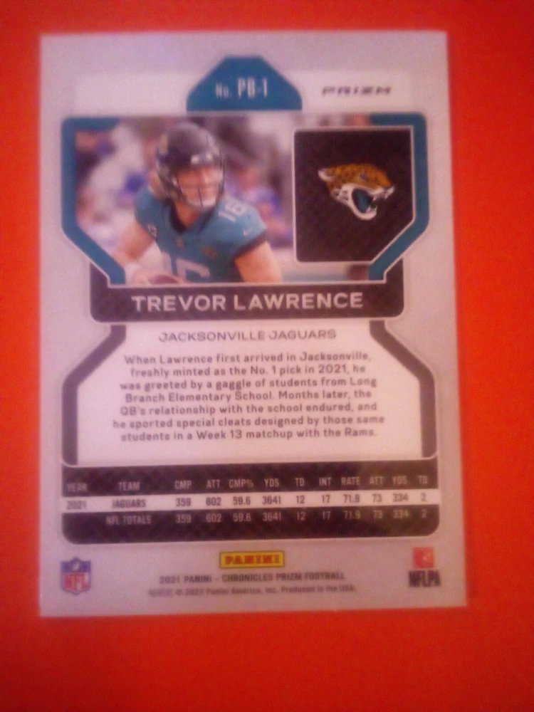 This is a 2021 Panini Prizm Football Rookie card featuring Trevor Lawrence of the Jacksonville Jaguars. The card has a Black and Silver Holo design and is part of the 2021 Panini Prizm set. It is a Sports Trading Card with a Card Number of No. PB-1 and is manufactured by Panini. The card features the National Football League (NFL) player and athlete and is a great addition to any football fan's collection.