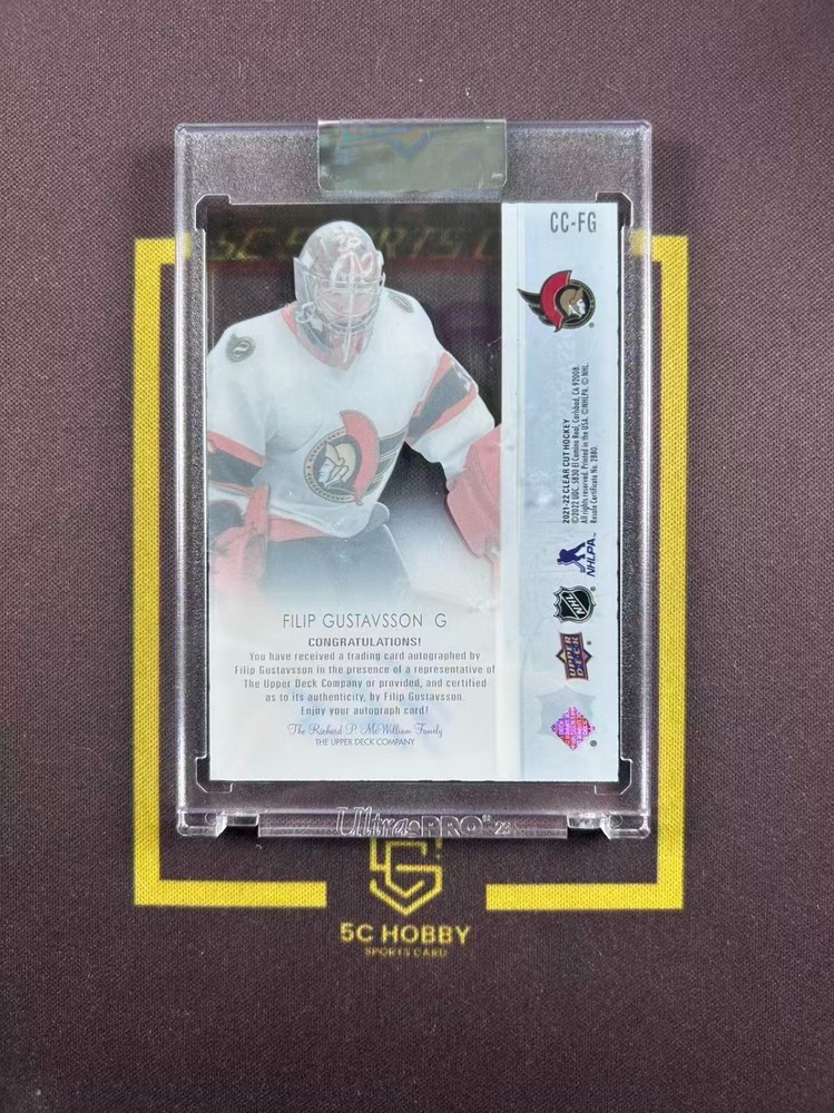 The 2021-22 Clear Cut Rookie Auto Filip Gustavsson FCLE is a highly sought-after sports trading card in the National Hockey League (NHL). This card features a hard-signed autograph from the rookie player Filip Gustavsson of the Ottawa Senators, making it a valuable collectible for fans and collectors alike. Manufactured by Upper Deck as part of the 2021-22 Upper Deck Clear Cut set, this original card is made of high-quality card stock and is part of the Stanley Cup Finals event. With its clear design and rookie designation, this card is a must-have for any ice hockey enthusiast.
