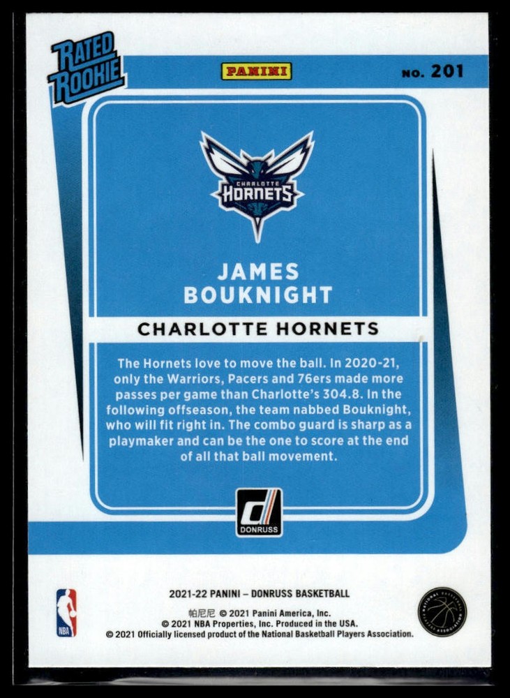 This is a nice example of a 2021-22 Donruss #201 James Bouknight Other important information about this card: Rookie RC,Chase,Checklist,Parallel,Insert,SP In 2021 James Bouknight played for the Charlotte Hornets. Please check out our other listings for more great cards.