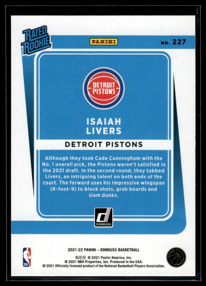 This is a nice example of a 2021-22 Donruss #227 Isaiah Livers Other important information about this card: Rated Rookie RC,Chase,Checklist,Parallel,Insert,SP,base In 2021 Isaiah Livers played for the Detroit Pistons. Please check out our other listings for more great cards.