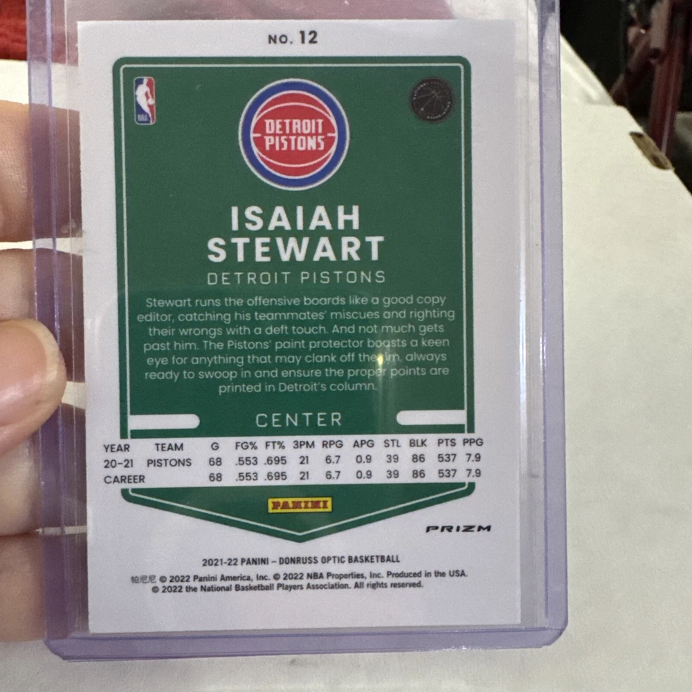 This 2021-22 Donruss Optic Fast Break Isaiah Stewart Purple Disco card is a must-have for any Detroit Pistons fan. With a card thickness of 20 Pt. and made of high-quality card stock material, this original and English language card is perfect for collectors. It features a disco parallel/variety, serial numbering, and is a short print, making it a rare find. The card is from the 2021-22 season and manufactured by Donruss in the United States. It is part of the National Basketball Association (NBA) league and has the player/athlete Isaiah Stewart on it. The card number is 12, and it is a standard size card. This card is not autographed, graded, or a reprint. It is an excellent addition to any sports trading card collection.