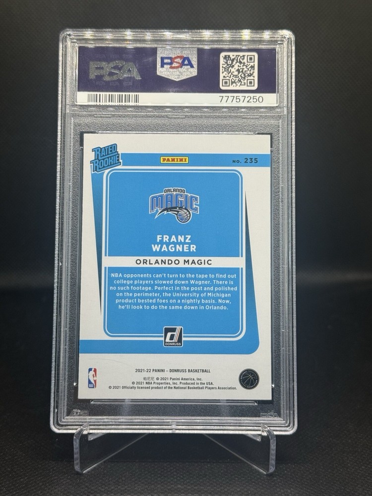 This is a 2021-22 Franz Wagner Rookie trading card from the 2021-22 Donruss set by Panini. The card features an Orange Holo Laser parallel, with card number 235. It is in Gem Mint condition, suitable for collectors. The card showcases Franz Wagner from the Orlando Magic, a promising talent in the National Basketball Association (NBA).
