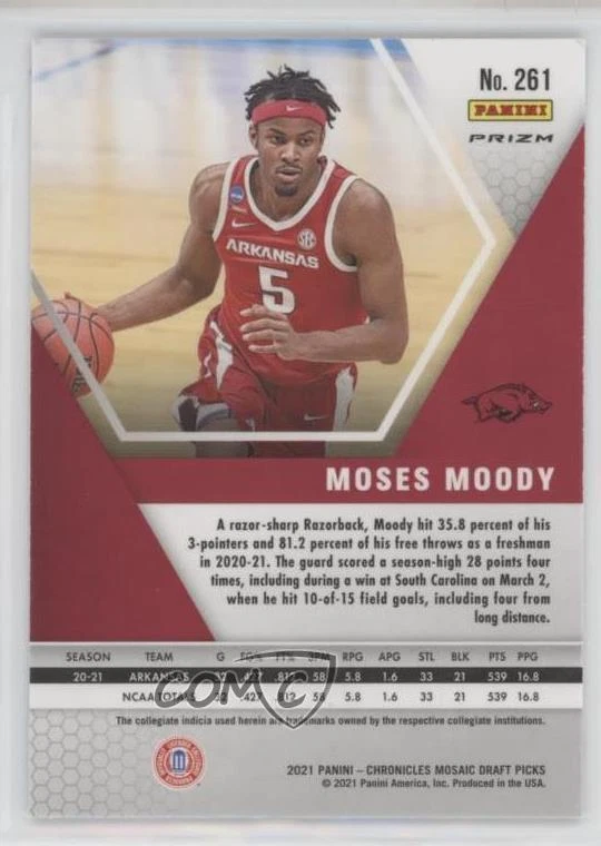 2021-22 Panini Chronicles Draft Picks - [Base] - Silver #261 Mosaic - Moses Moody - Rookie - Basketball Card - Featuring the Arkansas Razorbacks - Featuring Moses Moody Search for more: 2021-22 Panini Chronicles Draft Picks Search for more: 2021-22 Panini Chronicles Draft Picks - [Base] - Silver View all of our Listings Auctions Buy It Now About Us Located in the beautiful Pacific Northwest, COMC (Check Out My Cards) is the world's largest consignment service for trading card singles. More than 10,000 people have used our consignment service to list over 50 million trading cards. We currently house 20 million cards, each listed for sale with front and back images of the actual card. Find out how we can help you consign your items on eBay by contacting us through eBay messaging. COMC -- "The Safe & Easy Way to Buy & Sell" Representative Image - Select Specific Item above to see image of actual item Representative Image - Select Specific Item above to see image of actual item Raw Condition for Modern Cards Unless otherwise noted, raw modern cards are listed in Near Mint-Mint condition or better. A NM-MT card appears to be Mint at first glance, but upon closer inspection, may exhibit some of the following: minor print defects (e.g. roller marks, print line, dimple), minor scratches, slight edge wear, and slight corner wear. Centering is clearly visible in the images provided and does not factor into our condition assessment. Raw Condition for Vintage Cards Unless otherwise noted, raw vintage cards are listed in Excellent condition or better. An EX card may exhibit some of the following: minor rounding of corners, surface wear, print defects, light scratches, and slight edge wear/chipping. Centering is clearly visible in the images provided and does not factor into our condition assessment. Domestic Shipping Combined shipping for multiple items is available. To receive combined shipping, please ensure all desired items are in your eBay shopping cart before proceeding to checkout. eBay limits orders to 40 items per order. We automatically combine multiple orders placed on the same day. If you place multiple orders on the same day, please contact us to request a refund of applicable shipping costs. Signature confirmation may be required on invoices over $400. Raw cards are shipped in toploaders. International Shipping COMC offers eBay's International Shipping (EIS) for international orders under $2,500* (see country exceptions below). All duties and import fees are paid at checkout; in the rare event that there are additional import fees upon delivery, these are borne by the buyer. EIS packages route through a shipping hub in Erlanger, KY before shipping to their final destination. Please note that EIS does not allow for combined shipments. The shipping rates are determined by eBay and cannot be adjusted. *Maximum sale price exceptions: Colombia, Kuwait ($2,000); Taiwan ($1,539); Chile, Costa Rica, Guatemala, Honduras, Trinidad and Tobago ($1,000); Antigua and Barbuda, Aruba, Belize, Dominica, Grenada, Philippines, Saint Kitts and Nevis, Saint Lucia, Montserrat, Turks and Caicos Islands ($500); Dominican Republic, El Salvador ($200). Please request a shipping quote through eBay messaging for orders that exceed the maximum sale price supported by eBay's International Shipping. You will be responsible for all duties and import fees for international orders shipped outside the EIS. Raw cards are shipped in toploaders. Payment COMC does not accept offers on our cards through our eBay storefront. COMC utilizes eBay’s managed payments system. If you are experiencing difficulties making a payment, please contact eBay for assistance. Return Policy Returns are only accepted on the rare occasion the item is not as described. If you are making a return, please initiate the return process through eBay so a mailing label can be provided for you. Prior to listing, our expert team carefully assessed this item to represent it accurately. Please review the description and high-definition images prior to purchasing to ensure this item meets your satisfaction. We welcome you to contact us if you have further questions about this item. Trust and Integrity COMC carefully assesses each item consigned to us to prevent fraudulent items from entering the marketplace. If you believe an item offered on COMC may be fraudulent, please contact us with details so we can investigate the issue. Items we determine are outside our supported items policy may be removed. Last Modified: 12/9/2024 9:41:10 AM PDT