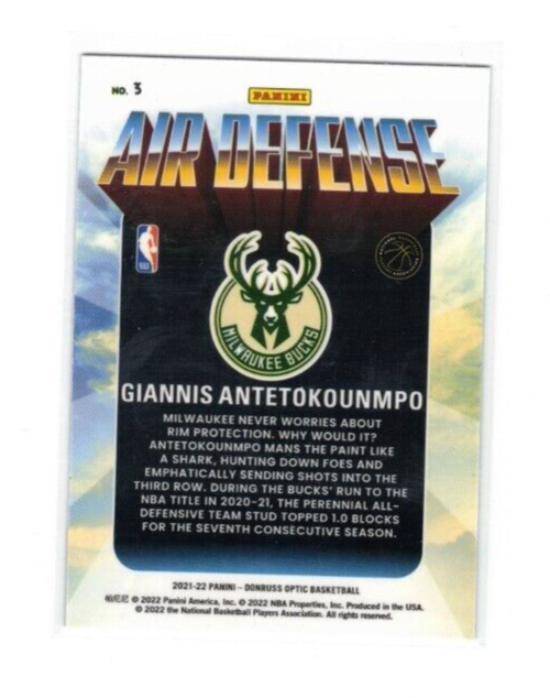 This trading card features Giannis Antetokounmpo of the Milwaukee Bucks from the 2021-22 NBA season. It is part of the Air Defense insert set in the 2021-22 Panini Donruss Optic collection. Manufactured by Panini, this sports trading card showcases Giannis in action on the basketball court, specifically highlighting his defensive skills. Perfect for fans of the NBA and collectors of sports trading cards, this card is a valuable addition to any collection. Card will ship in plain white envelope.