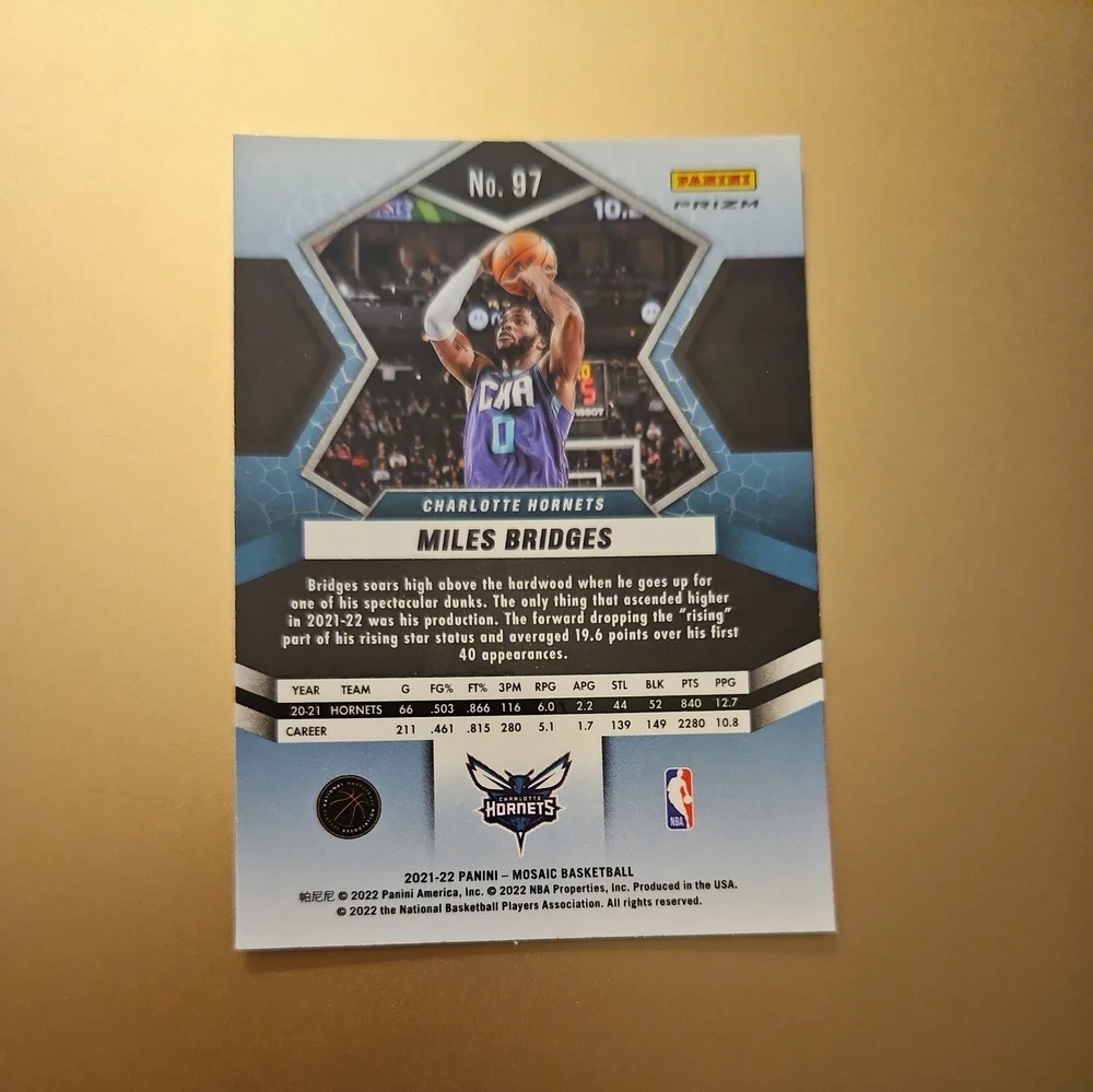 Sport:BasketballParallel/Variety:Mosaic PrizmType:Sports Trading CardManufacturer:PaniniPlayer/Athlete:Miles BridgesSeason:2021-22Card Number:97League:National Basketball Association (NBA)Set:2021-22 Panini MosaicFeatures:Parallel/Variety, Base Set