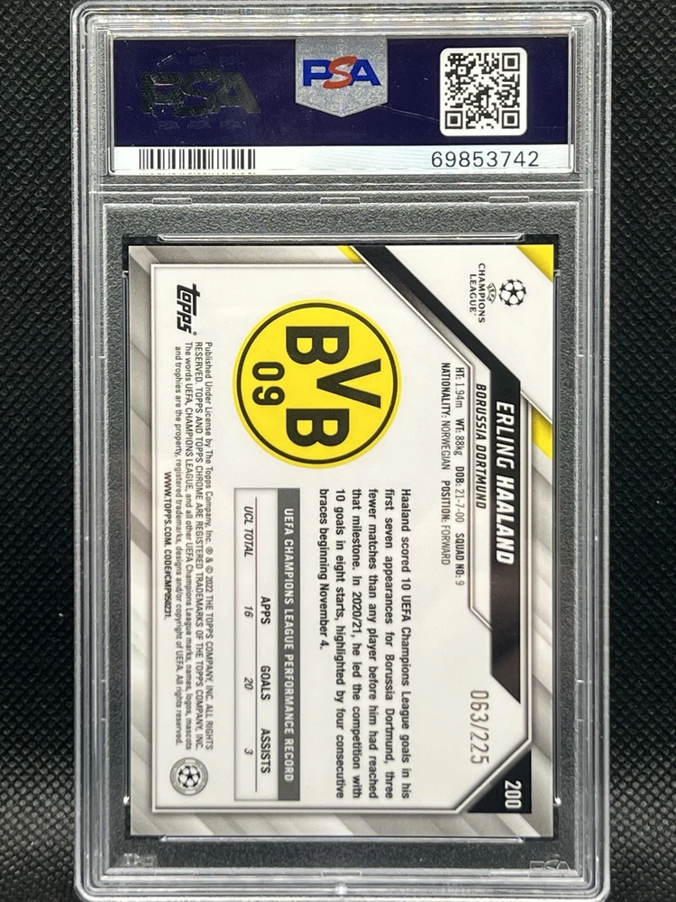 This rare Erling Haaland 2021-22 Topps Chrome UCL trading card is a must-have for any soccer fan or card collector. With only 225 prints available, this card is a true gem. It features a stunning Night Vision Refractor design and has been graded a perfect PSA 10. The card showcases Haaland in his Borussia Dortmund kit and is part of the 2021-22 Topps Chrome UCL set. It is a single card and comes with a serial number. This card is a great addition to any collection and is sure to increase in value over time.
