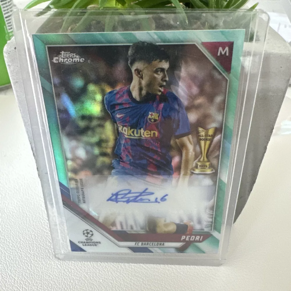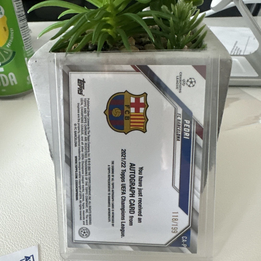 2021-22 Topps Chrome UEFA PEDRI #CA-P Auto Aqua /199 Barcelona trading card featuring the talented soccer player in a rare Aqua parallel. This sports trading card is a must-have for fans and collectors alike, showcasing Pedri in action during the 2021-22 season. Add this limited edition card to your collection and show your support for Barcelona's rising star.