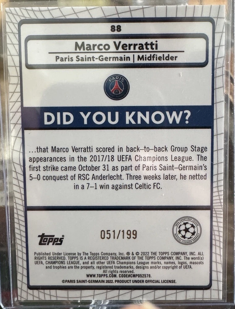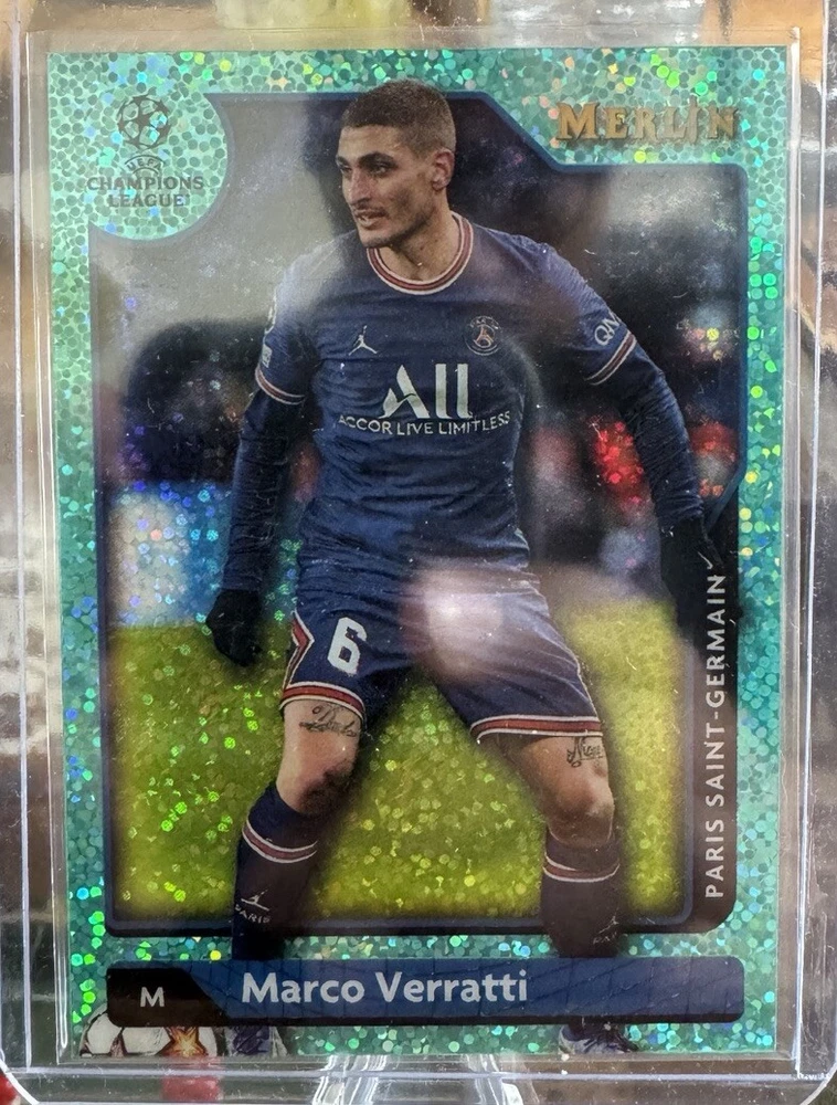 This is a rare 2021-22 Topps Merlin Collection UCL sports trading card featuring Marco Verratti from Paris Saint-Germain. The card is part of the Aqua Prism Refractor parallel/variety and has a print run of 51/199. It is a great addition to any soccer fan's collection and is perfect for those who appreciate the beauty of the sport. The card comes from the Topps manufacturer and is part of the base set. It is a must-have for any collector who loves soccer and wants to add a unique card to their collection.