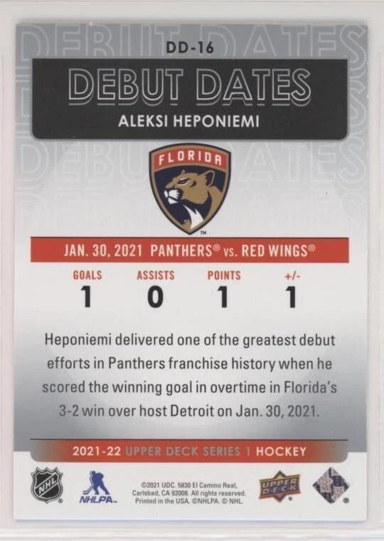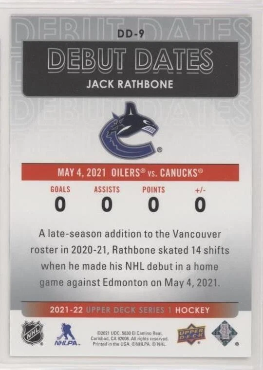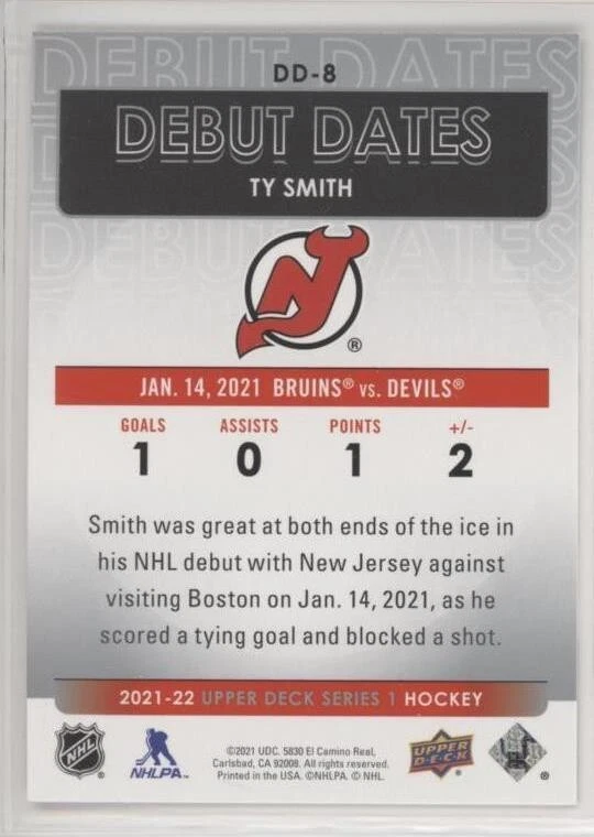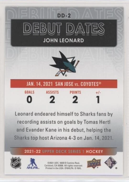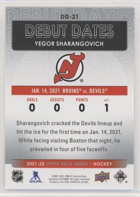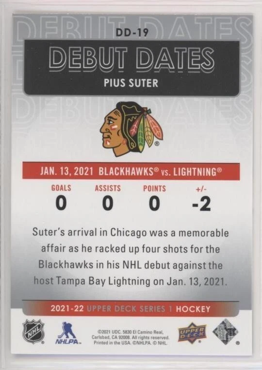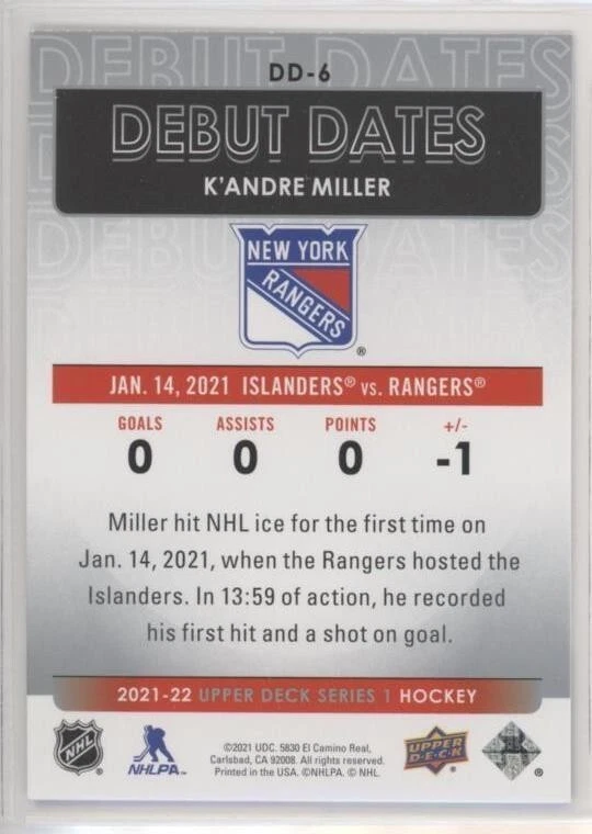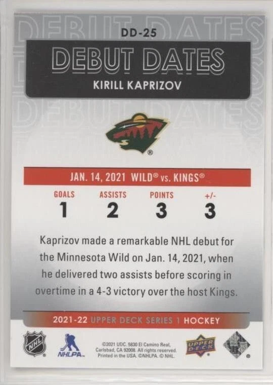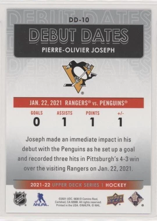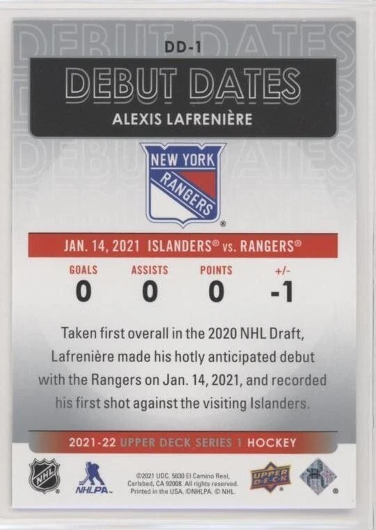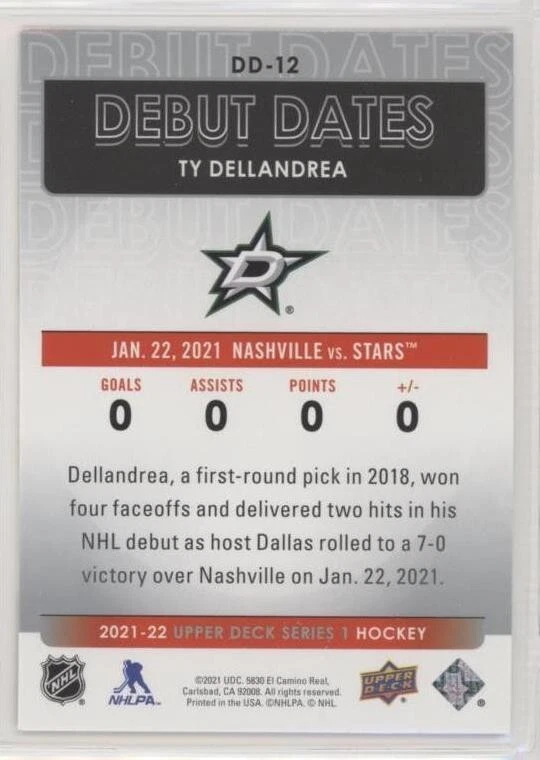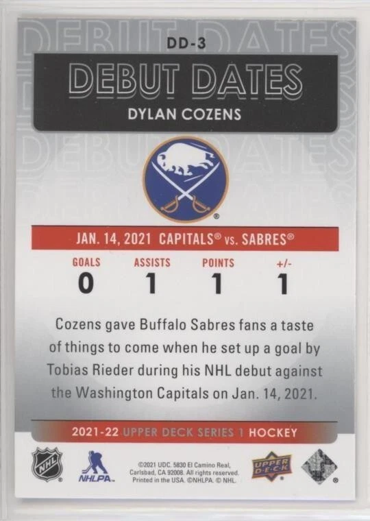 All Cards Fresh from Packs 2021-22 Upper Deck Series One Hockey Debut Dates Inserts #DD-1–DD-25 (Pick from List) Overall Debut Dates Odds : 1:16 hobby, 1:16 e-Pack, 1:16 retail, 1:32 blaster, 1:16 tin, 1:8 fat packs, 1:8 mega fat packs Well-protected; shipped via USPS For International Orders: When ordering multiple items, eBay International Shipping charges are combined. As a low-cost alternative, international shipping without tracking is available (See ** below). Thanks for your interest and be sure to visit our eBay store for more great items! ** For international shipping without tracking, no refunds will be given if the item is lost or damaged in transit (this is rare). If you prefer to pay for tracked shipping, please send us an email before submitting payment.
