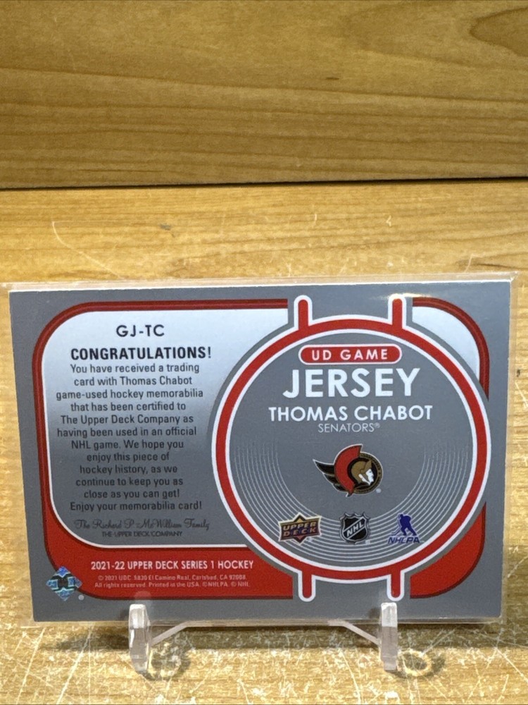 21/22 UPPER DECK SERIES 1 UD GAME JERSEY #GJ-TC THOMAS CHABOT. Condition is Ungraded. Shipped with Canada Post Lettermail.