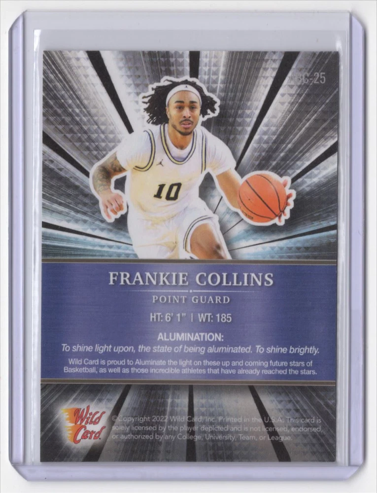 About Me Other Listings Feedback Add to Favorites Contact Me Striking Cards 901 2021-22 Wild Card Alumination Frankie Collins #ABC-25 No stock photo / These are real scans or pictures Details Description: Frankie Collins Category: Basketball Year: 2021 Product: Wild Card Alumination Card Number: ABC-25 Dimensions: 4" x 3" SKU: BK B0001 R01 F (304) Shipping If combined shipping is requested, we will send an invoice with the combined shipping charges as soon as possible. Please keep in mind that, in order to keep shipping costs down, we may need to put two cards into the same top-loader. Also, keep in mind that the tracking on eBay Standard Shipping (plain white envelope) is not very dependable. If you would like upgraded shipping to Ground Advantage, which gives more accurate tracking, just ask and we'll send you an invoice with those amounts! Listing By Kronocard trading cards software v2.6.5.5