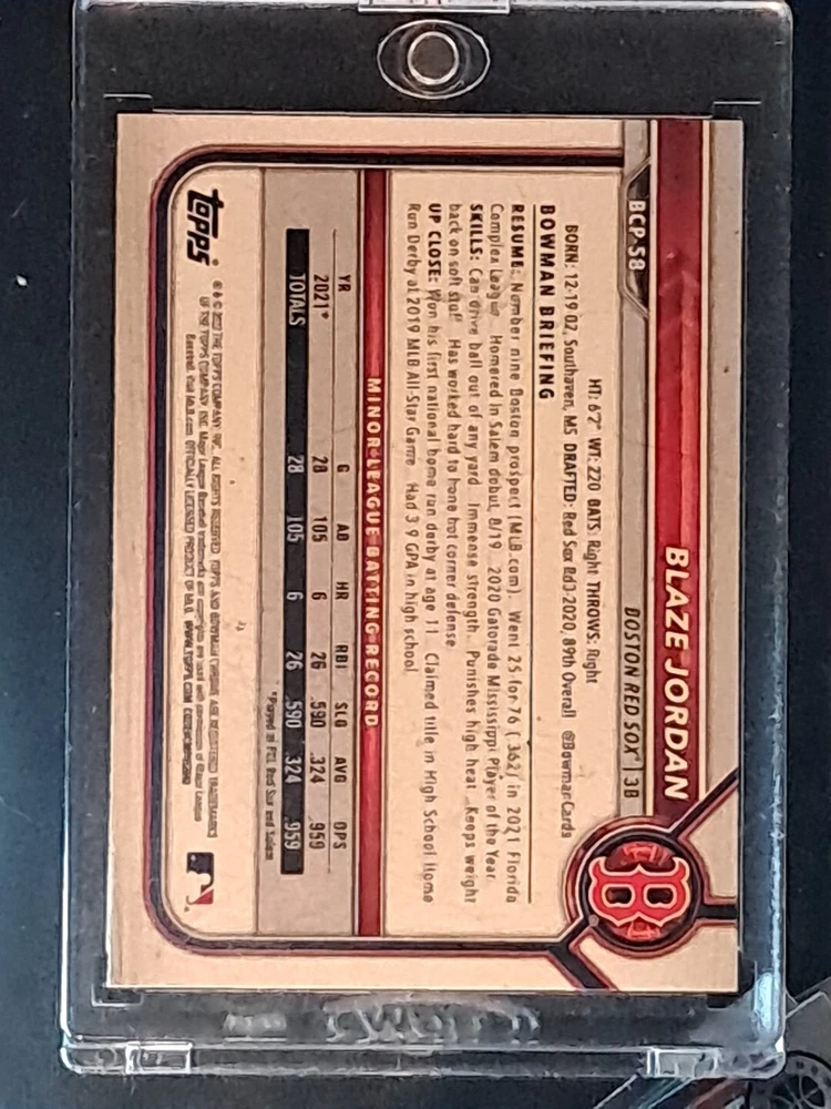 the 2022 Bowman Mega Box Chrome variations are super short prints falling 1:310 packs. This is even tougher than it seems since the boxes each have just two Chrome packs, meaning there is just one variation in every 155 boxes. This Blaze Jordan is a Must have for any serious Collector.
