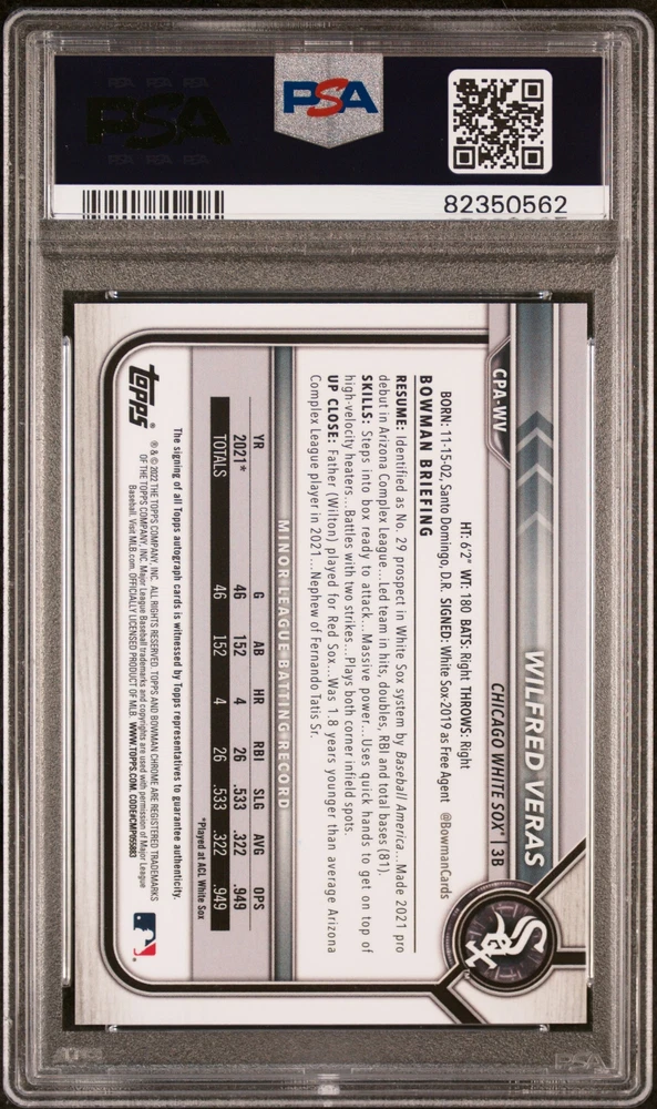 You are purchasing a 2022 Bowman Chrome Prospect Autographs Wilfred Veras #CPAWV PSA 10. You will receive the exact item in the photographs. Thank you for looking. Listed With Mascot .