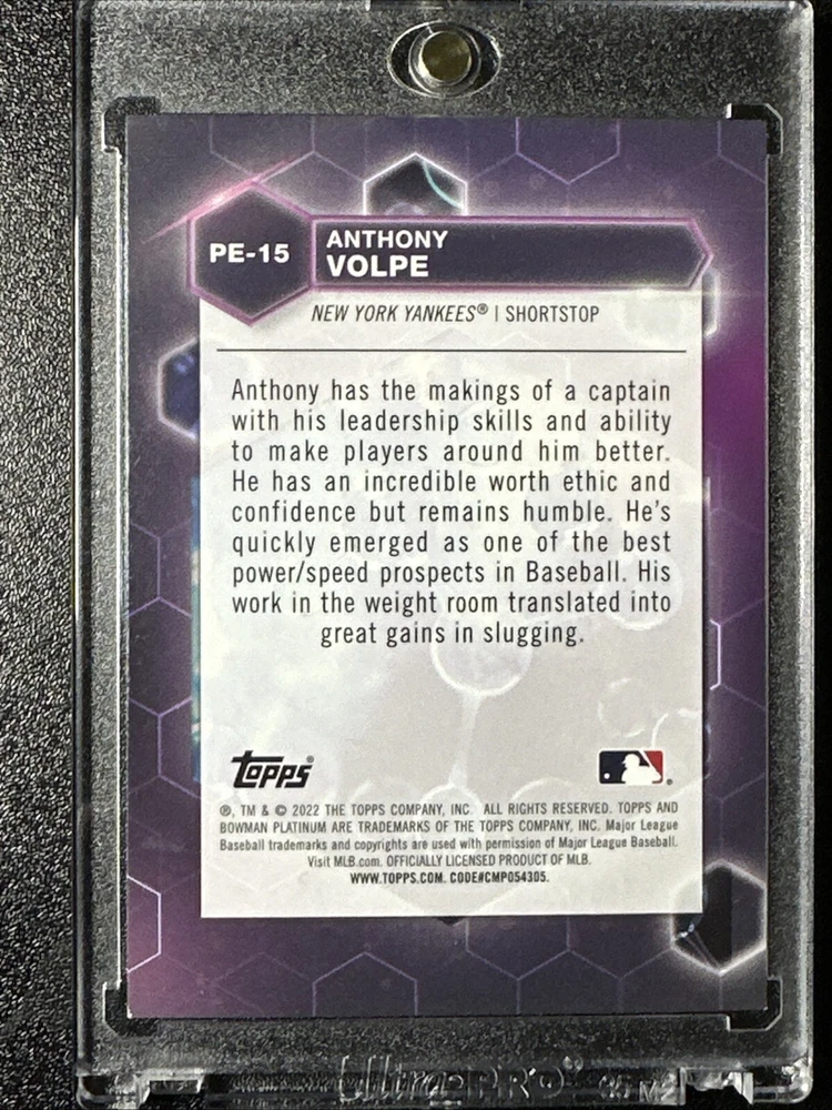 This 2022 Bowman Platinum sports trading card features Anthony Volpe, a rookie player for the New York Yankees in Major League Baseball (MLB). The card is part of the Precious Elements insert set and has a card number of PE-15. It is a great addition to any collection for fans of baseball and sports trading cards. The card is manufactured by Topps and is from the 2022 season. The card has several features that make it a valuable addition to any collection. It is an insert card and is part of the Bowman Platinum set. The card is perfect for fans of the New York Yankees and collectors of sports trading cards. It is a must-have for anyone who wants to complete their collection or add a valuable piece to it. The card will ship in a penny sleeve, card saver, and mylar bag. It will NOT ship in a one touch. The buyer pays for shipping. Card comes AS IT IS LISTED IN THE PICTURES!! Any other questions let me know and check out my other auctions!