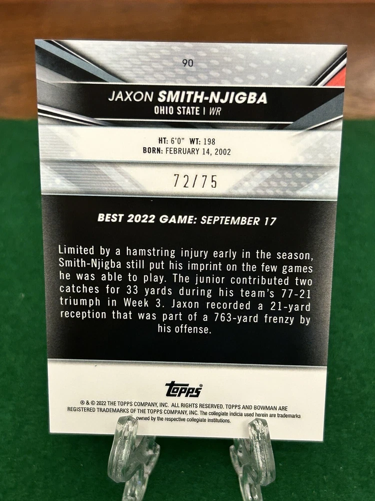 2022 Bowman's Best Jaxon Smith-Njigba Ohio State #90 Gold Lava /75 Seahawks. Some whiting on top-left corner as seen from front. I WILL COMBINE SHIPPING ON ANY OF MY ITEMS!!! JUST MESSAGE ME AND WE WILL WORK OUT THE BEST DEAL! IF YOU WIN MULTIPLE AUCTIONS, WAIT TO PAY AND I WILL SEND AN INVOICE WITH REDUCED SHIPPING COSTS.