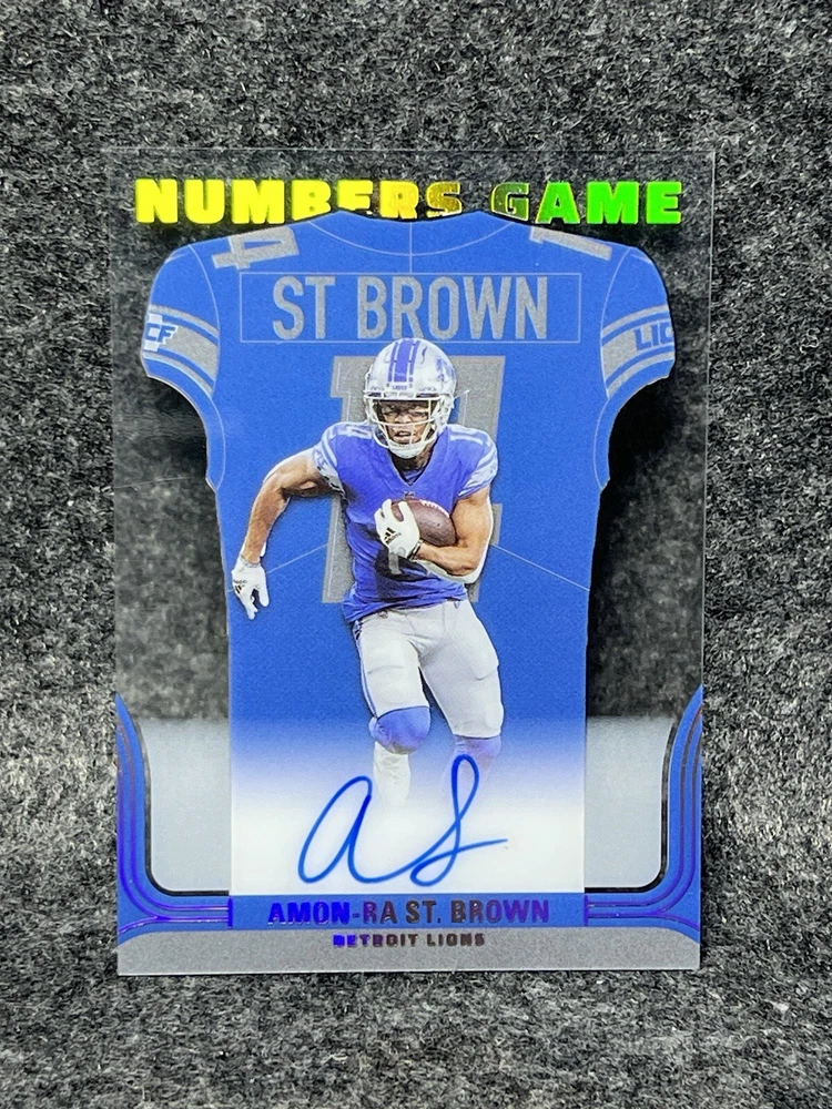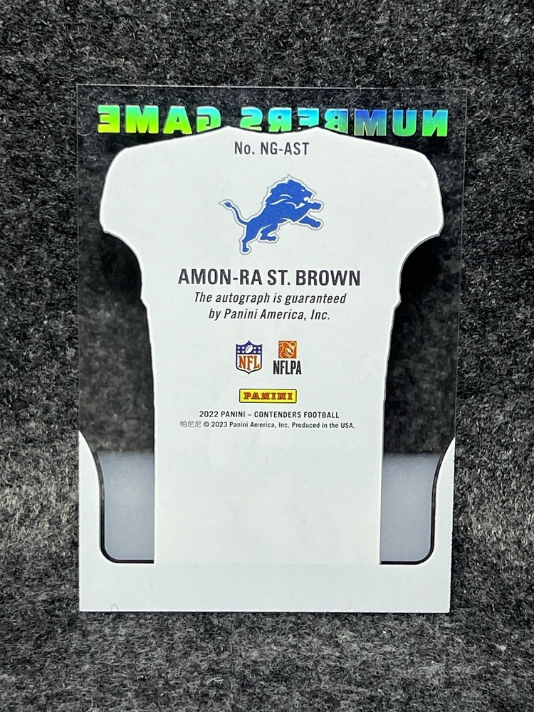 This 2022 Contenders Amon-Ra St Brown Numbers Game Acetate SP Auto #NG-AST trading card is a must-have for any Detroit Lions fan. Featuring an autograph from the talented wide receiver, this card is a rare find for any collector. The card is also a short print, making it even more valuable to those who are looking to complete their collection. The card is made from acetate, giving it a unique look that is sure to catch the eye of any collector. It is also a sports trading card, making it a great addition to any collection that is focused on sports memorabilia. With the season and player information clearly stated on the card, it is a great investment for any fan of the game. Cards are packaged properly. Sent with secure envelope for guaranteed delivery. What you see is what you get.
