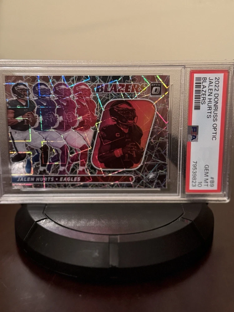 This 2022 Donruss Optic Jalen Hurts Blazers Case Hit PSA 10 Gem Mint trading card is a must-have for any football fan. Featuring a stunning image of the talented quarterback, this sports trading card is perfect for collectors looking to add to their collection. With its Optic parallel/variety and Donruss manufacturer, this card is sure to be a standout in any collection. The PSA 10 Gem Mint rating ensures the quality of the card is top-notch, making it a valuable addition to any sports trading card collection. Add this card to your collection today and show off your love for football!