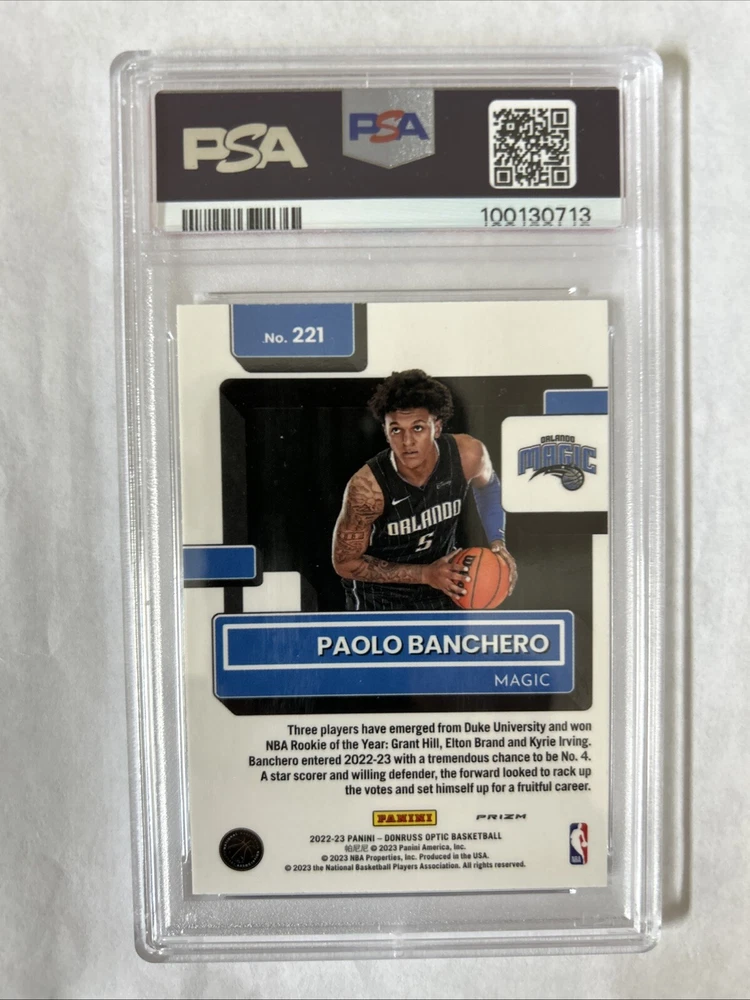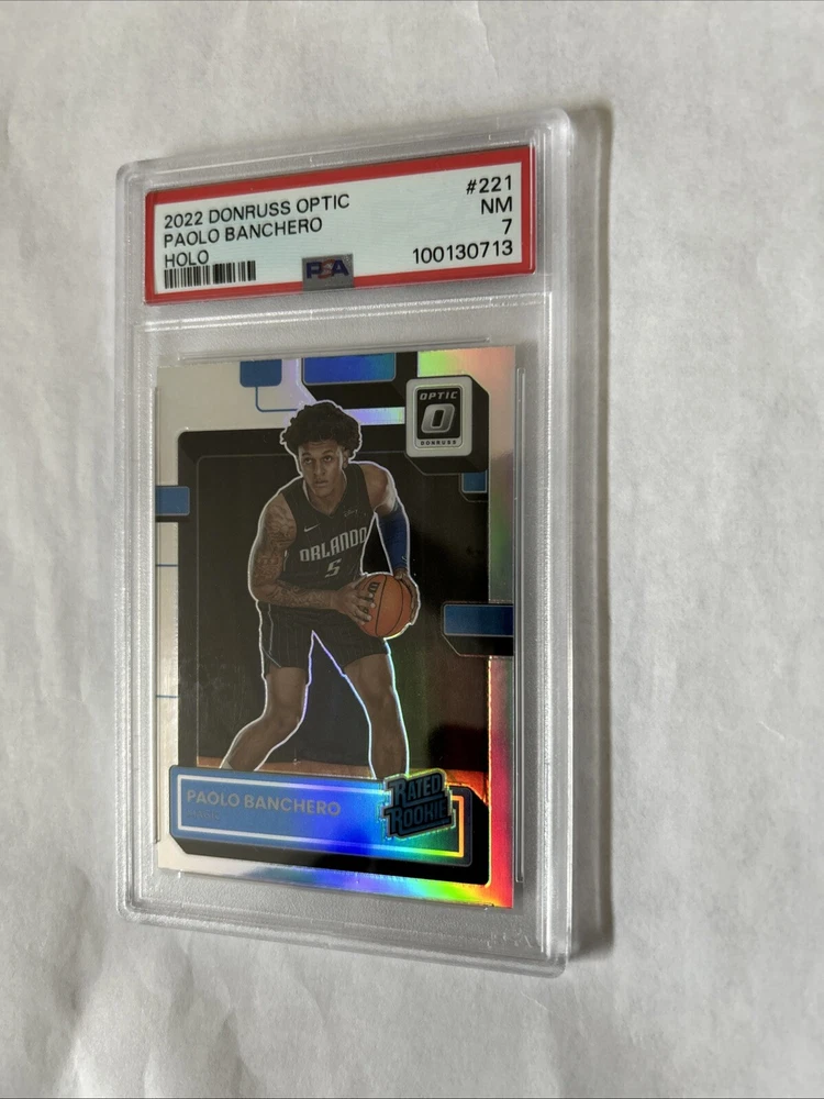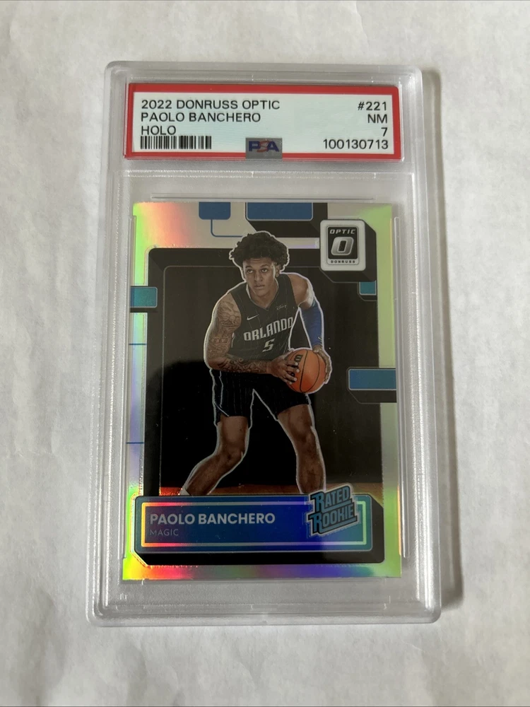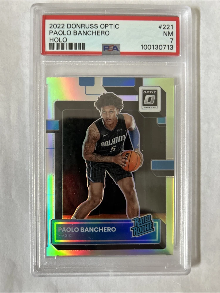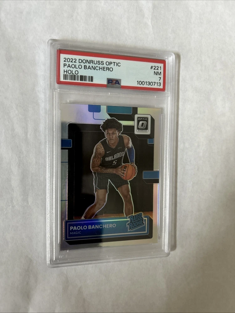 Elevate your sports card collection with the 2022 Donruss Optic Paolo Banchero Holo #221 RC Rookie card. Graded PSA 7 Near Mint. As a standout addition, this card features the talented basketball player Paolo Banchero and comes from the renowned Donruss Optic set, a favorite among collectors for its sharp aesthetics and premium finish.