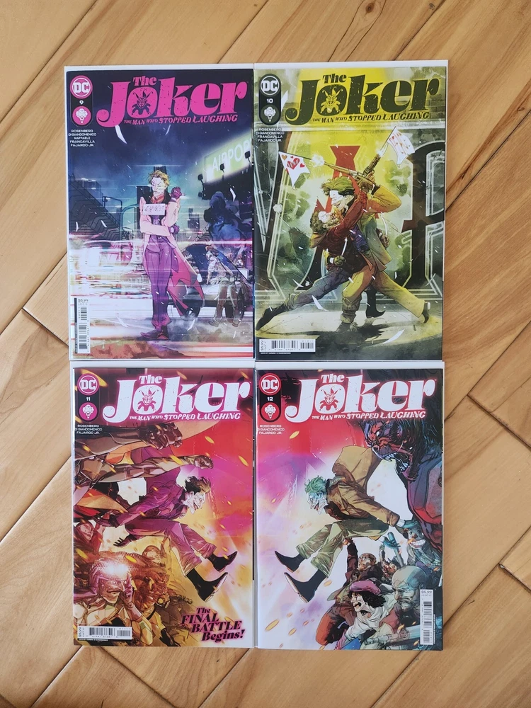 This 12-issue comic book lot features the Joker in a modern age storyline titled "The Man Who Stopped Laughing." The series is published by DC Comics and includes cover art by Carmine Di Giandomenico. The issues are all high grade 9.6 near mint+ and feature cover A. The series is written by Matthew Rosenberg with art by Francesco Francavilla and Carmine Di Giandomenico. It includes a range of features, including first printing and a set of issues. The intended audience is general, and the language is English. This collectible item is perfect for fans of action and US comics. Bagged and boarded shipped in Gemini mailer. USPS.