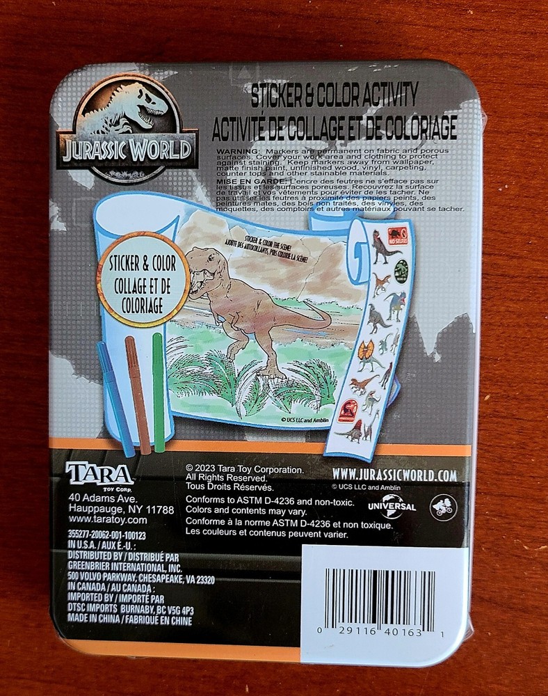 Get ready for an adventure with the NEW 2022 Tara Toy Jurassic World Dominion mini Sticker and Color Activity Tin Set. This set is perfect for kids who love crafts and Jurassic World. The set includes stickers and coloring activities that are sure to keep your child engaged for hours. The tin is durable and can be used to store the stickers and coloring pages when not in use. The set is suitable for children of all ages and is a perfect gift for any occasion.