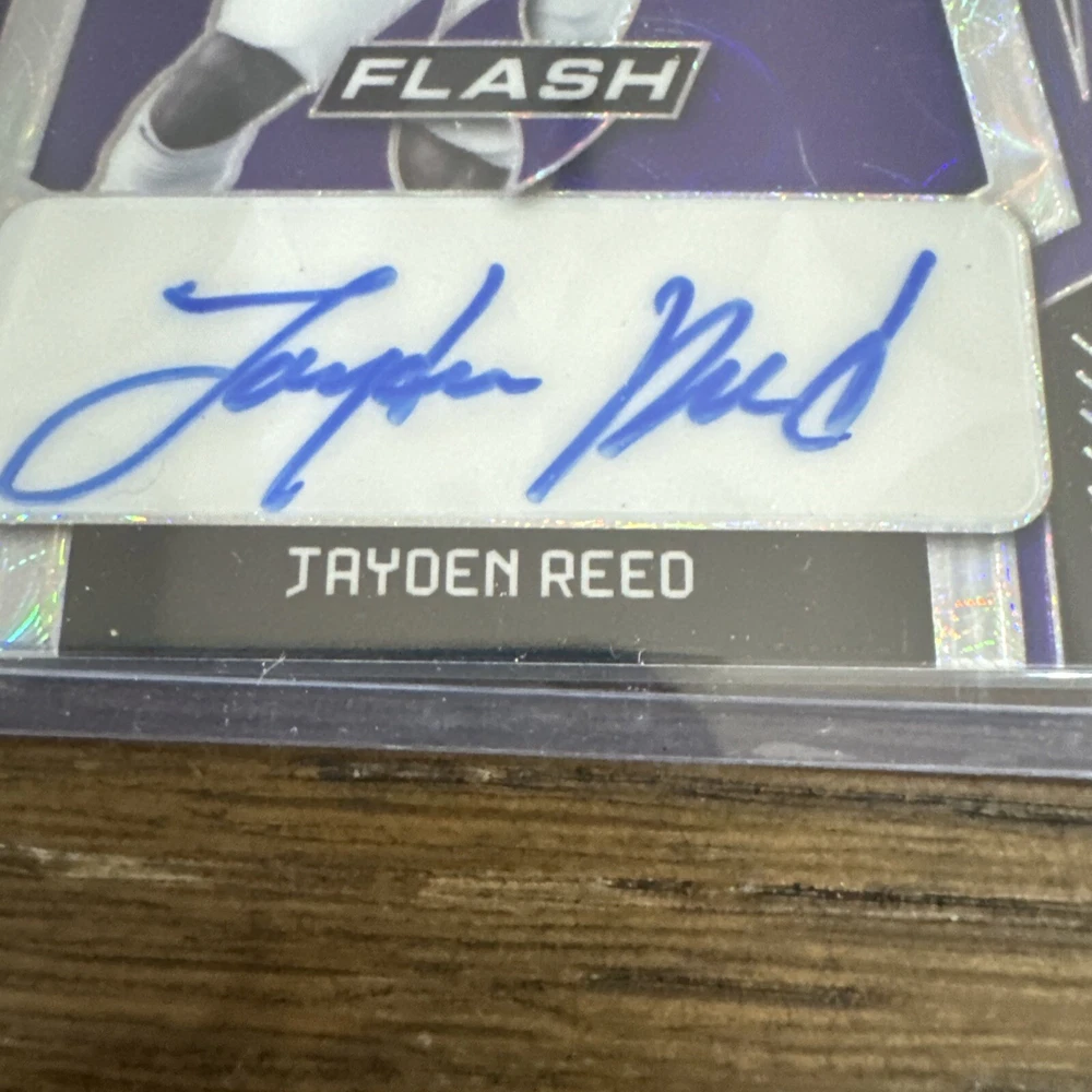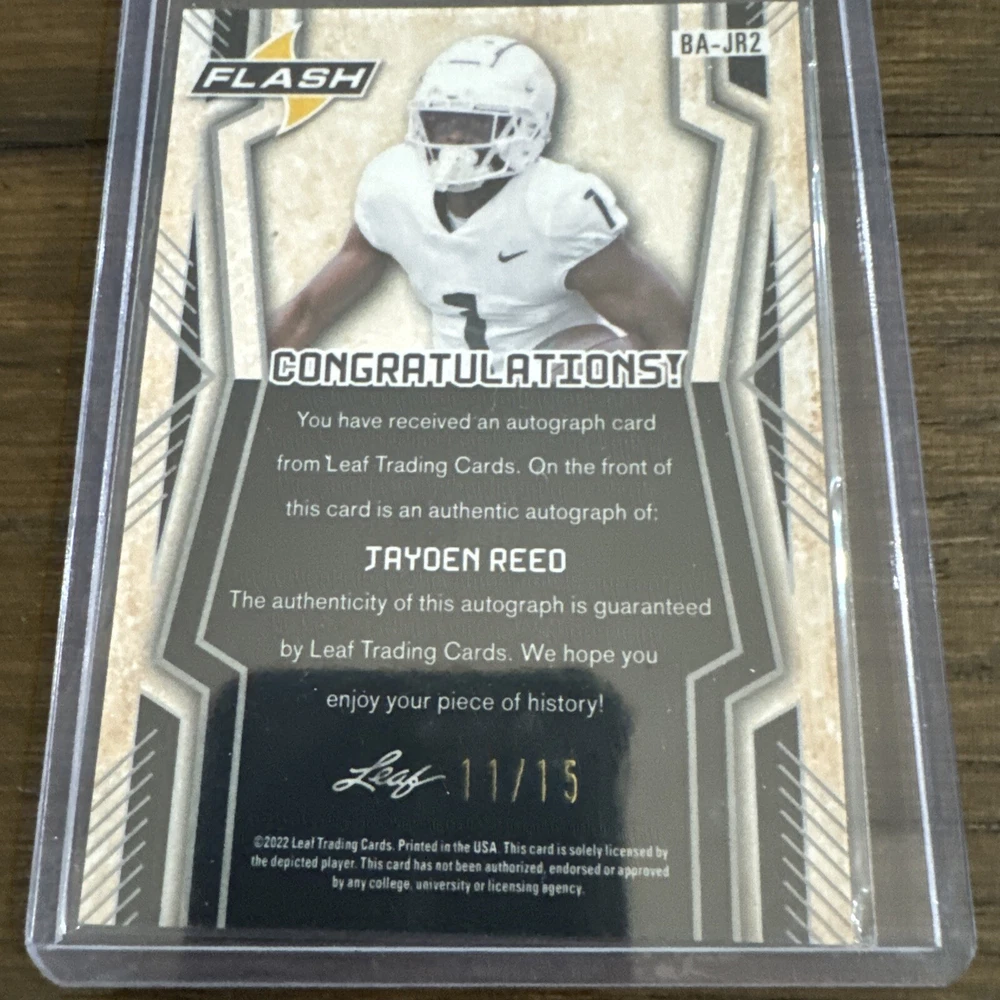 This is a 2022 Leaf Valiant Football trading card featuring an autograph from Jayden Reed, signed in a Label or Sticker format. The card is a Purple Scope parallel variety, with a limited print run of only 15 copies, and it showcases a Jersey Match design. It is a Take it to House Rookie Autograph insert card, serial numbered as #11/15, making it a rare and highly sought-after collectible for fans of the Green Bay Packers and Michigan State Spartans wide receiver.
