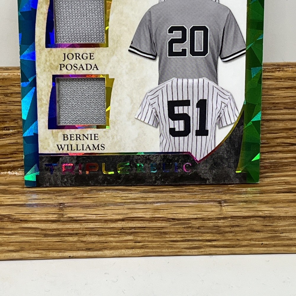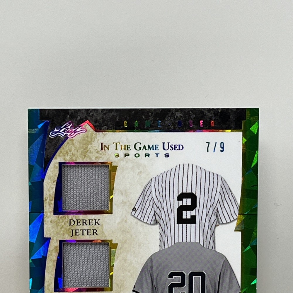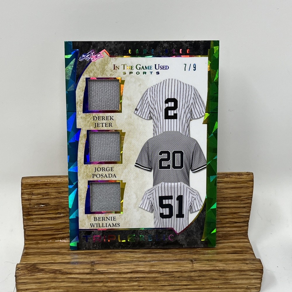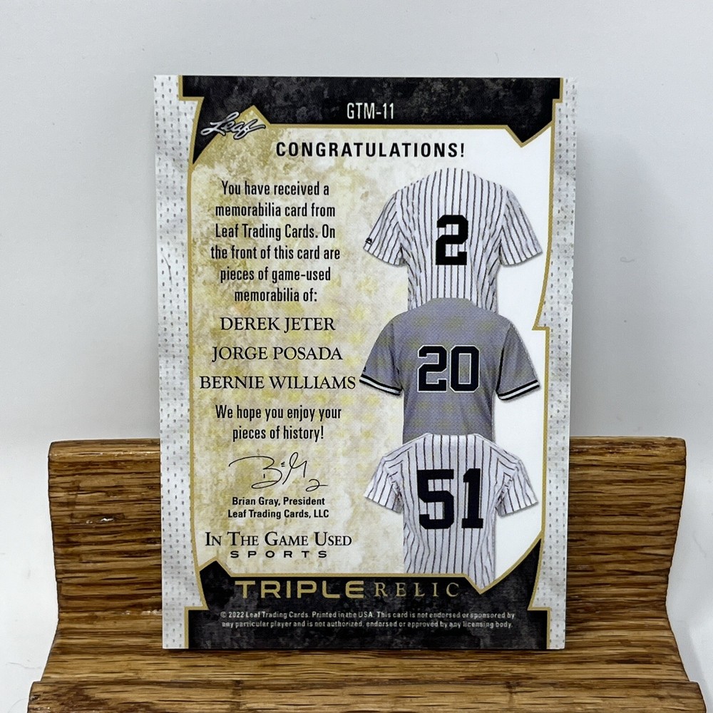 Capture a piece of baseball history with the 2022 Leaf In The Game Used Leaf card featuring iconic New York Yankees players Derek Jeter, Jorge Posada, and Bernie Williams. This card, numbered GTM-11, comes from the respected Leaf manufacturer and boasts an eye-catching Rainbow parallel/variety, adding a unique aesthetic to your collection. The card is a tribute to the legendary careers of these three athletes, incorporated into a memorabilia insert from the 2022 season. While not autographed, it stands as a remarkable sports trading card for fans and collectors alike, representing the Major League Baseball experience with a tangible piece of the sport's storied past.