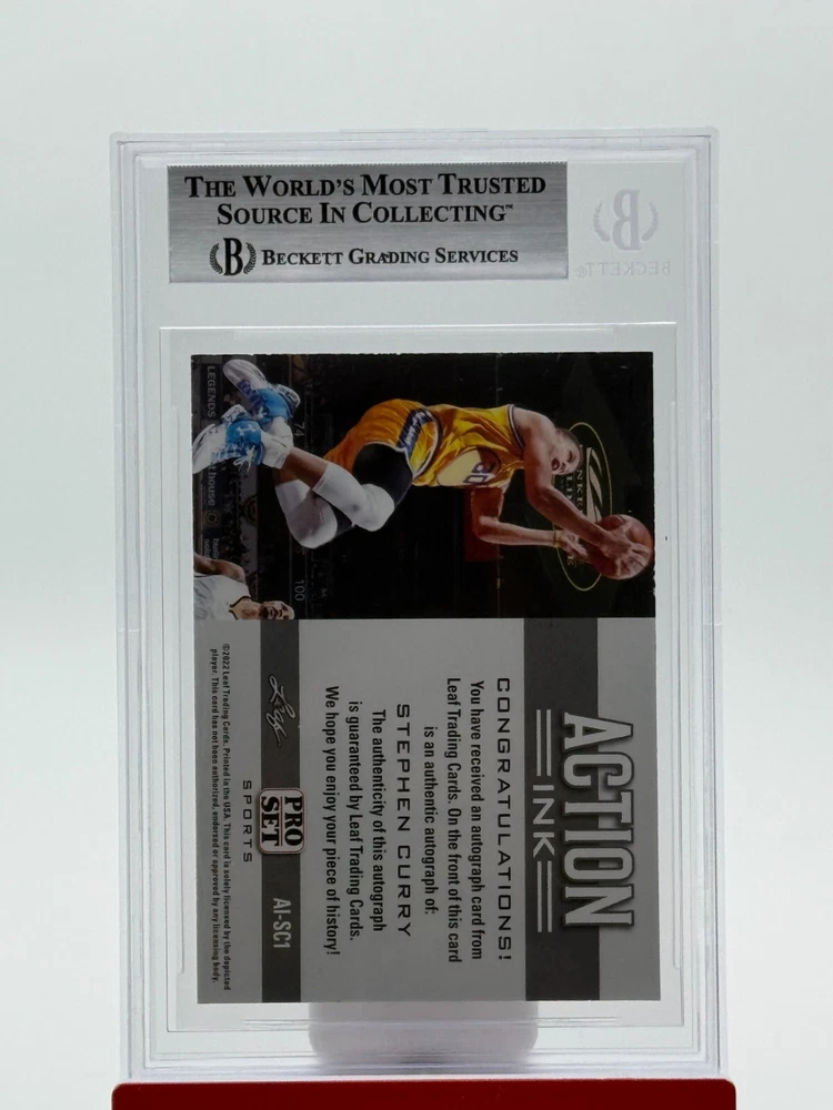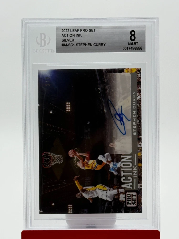 This is a 2022 Leaf Pro Set Sports trading card featuring an autograph from Stephen Curry of the Golden State Warriors. The card is from the Action Ink Autographs insert set and is a Silver parallel variety, with only 2 copies ever produced. It has been graded BGS 8 Near-Mint by Beckett Grading Services It is numbered as #AI-SC1 and authenticated by Leaf. This collectible item is a rare and valuable piece for fans and collectors of Steph Curry and basketball memorabilia. We will combine Shipping on multiple purchases. Add $0.50 for each additional item up to $4.50 Be sure to check our store for other great deals.