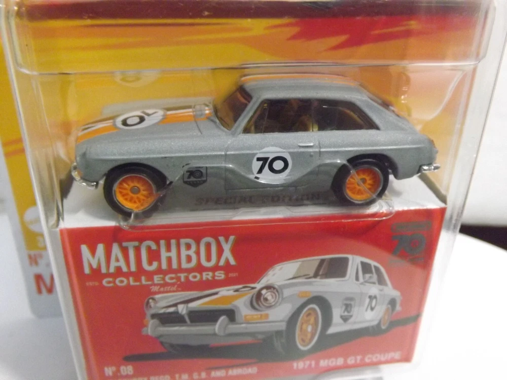 This auction is for a 2022 Matchbox, 70th Special Edition, 1971 MGB GT Coupe, No. 8 . Car is mint, Card is near mint, Winning bidder pays $5.50 for Shipping and Handling with Delivery Confirmation in the U.S.A. Will combine shipping. ,