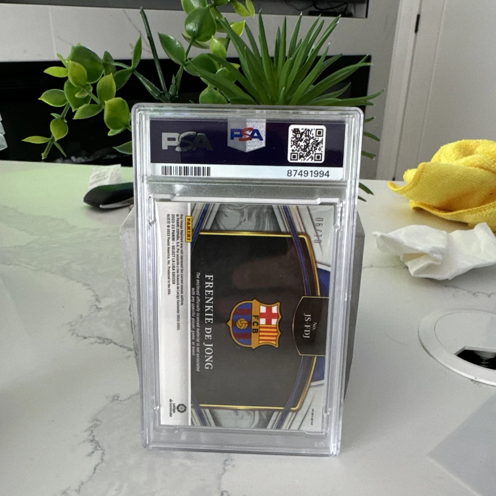 2022 PANINI SELECT LA LIGA FRENKIE DE JONG JUMBO SWATCH GOLD /10 MINT PSA 9 - This rare sports trading card features soccer player Frenkie de Jong from La Liga in a limited edition Gold parallel variety. With a Jumbo Swatch design, this card is a must-have for collectors and fans alike. Graded PSA 9, this card is in mint condition and comes with a unique SKU for authenticity. Add this valuable piece to your collection today and showcase your love for the sport and the player. POP1 None higher