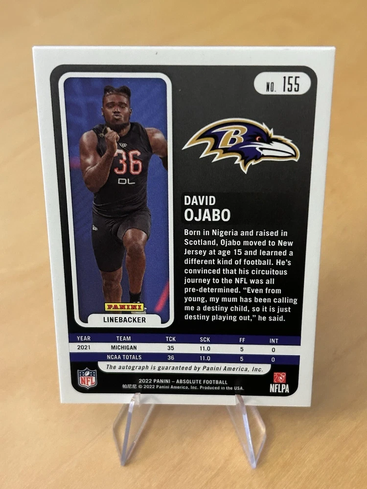 2022 Panini Absolute David Ojabo Silver Rookie Auto NUMBER MATCH /100 Ravens. Condition is Ungraded. Shipped with eBay Standard Envelope for Eligible Items up to $20.