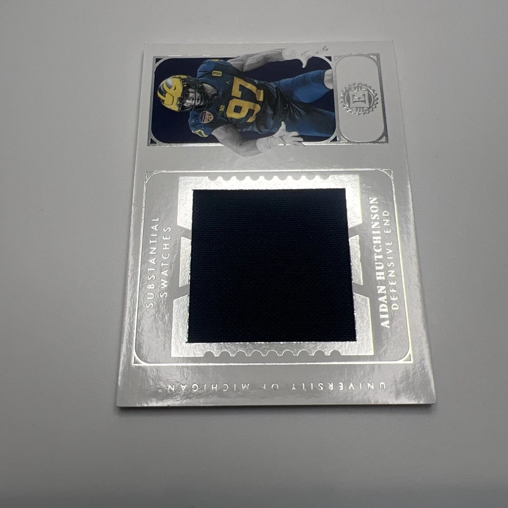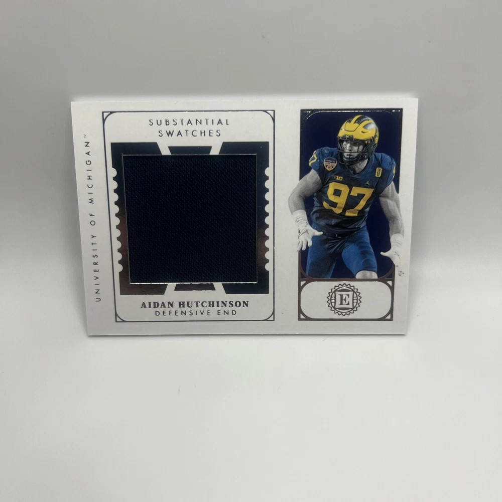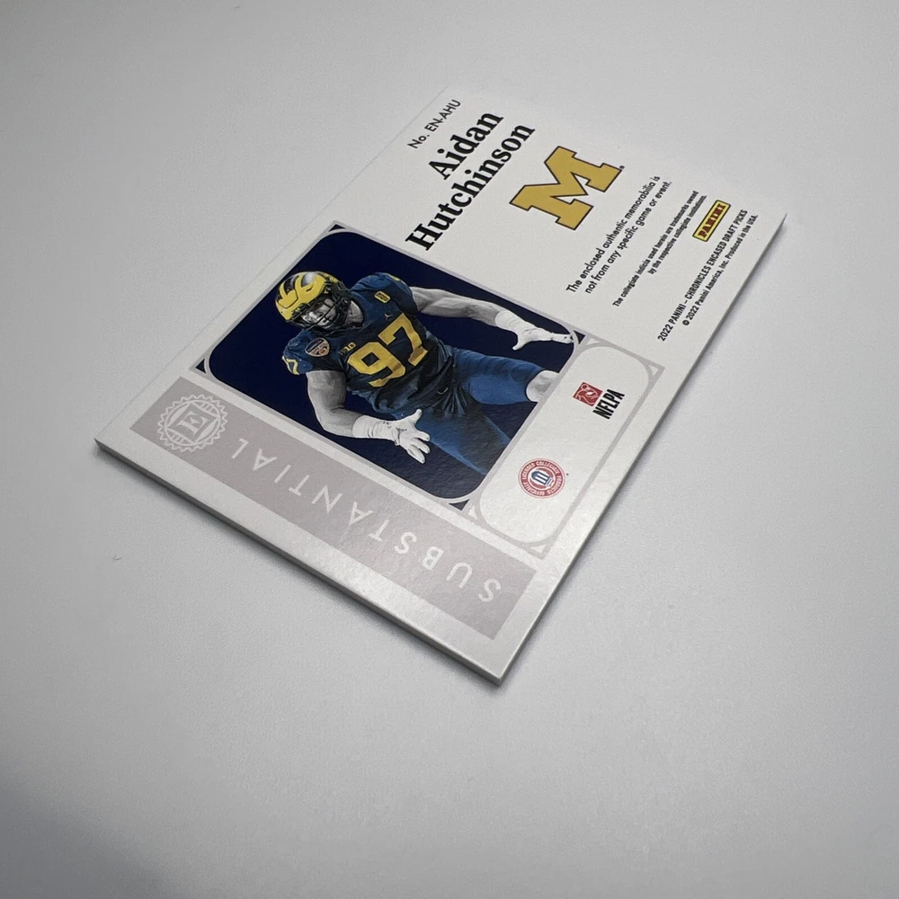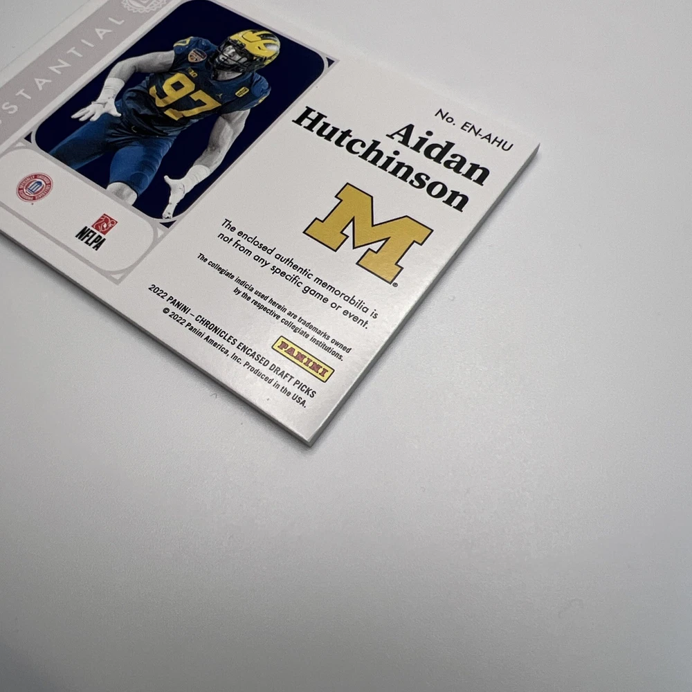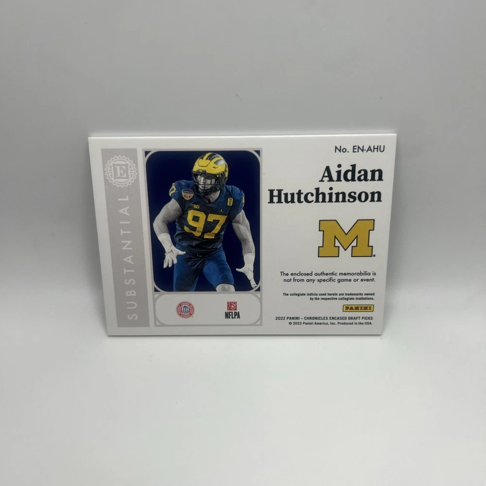 The 2022 Panini Chronicles Draft Picks Encased Substantial Swatches card features Aidan Hutchinson, a player from the Michigan Wolverines football team. This sports trading card is part of the National Collegiate Athletic Association (NCAA) league and manufactured by Panini in 2022. The card includes a piece of jersey material embedded in the card stock, making it a memorabilia card with Patch and SP (short print) features, as well as being encased for protection and collectibility. This particular card is an insert in the set, showcasing Hutchinson as a rookie player for fans and collectors to enjoy.