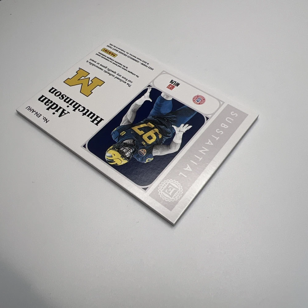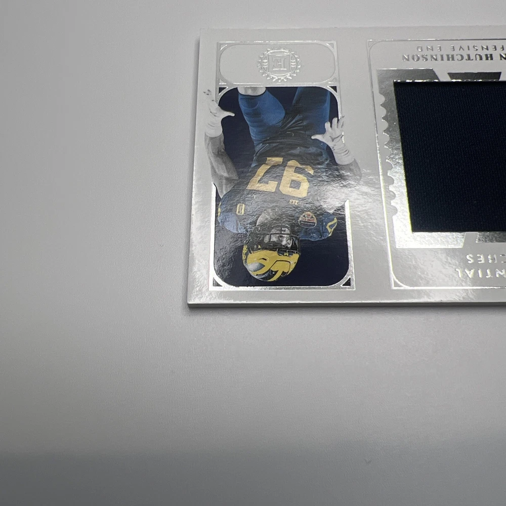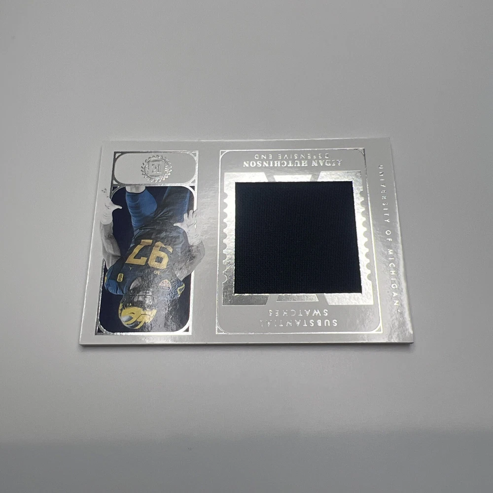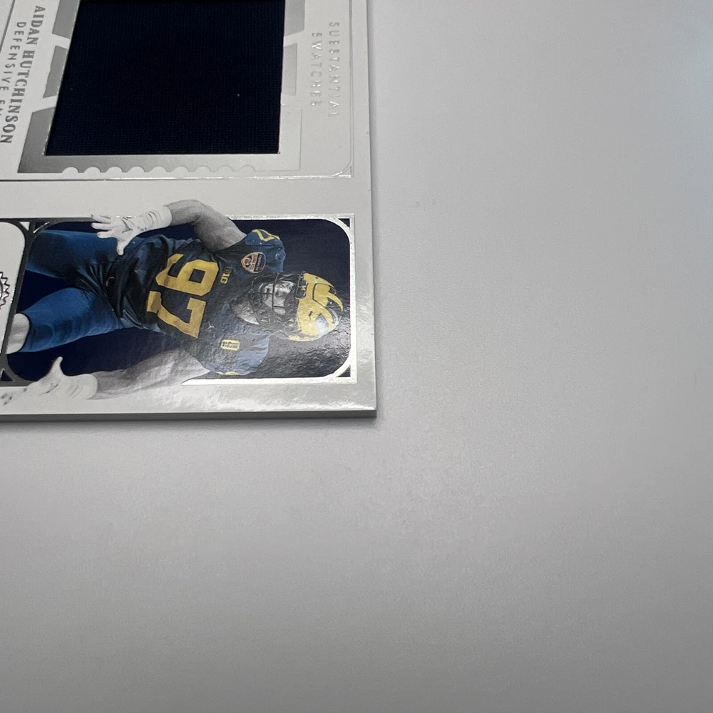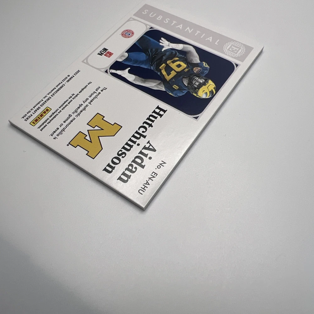 The 2022 Panini Chronicles Draft Picks Encased Substantial Swatches card features Aidan Hutchinson, a player from the Michigan Wolverines football team. This sports trading card is part of the National Collegiate Athletic Association (NCAA) league and manufactured by Panini in 2022. The card includes a piece of jersey material embedded in the card stock, making it a memorabilia card with Patch and SP (short print) features, as well as being encased for protection and collectibility. This particular card is an insert in the set, showcasing Hutchinson as a rookie player for fans and collectors to enjoy.