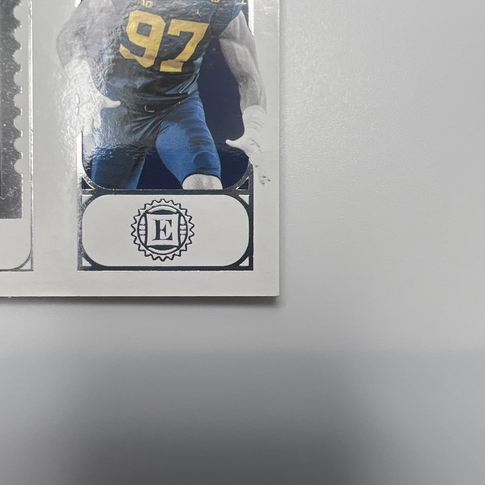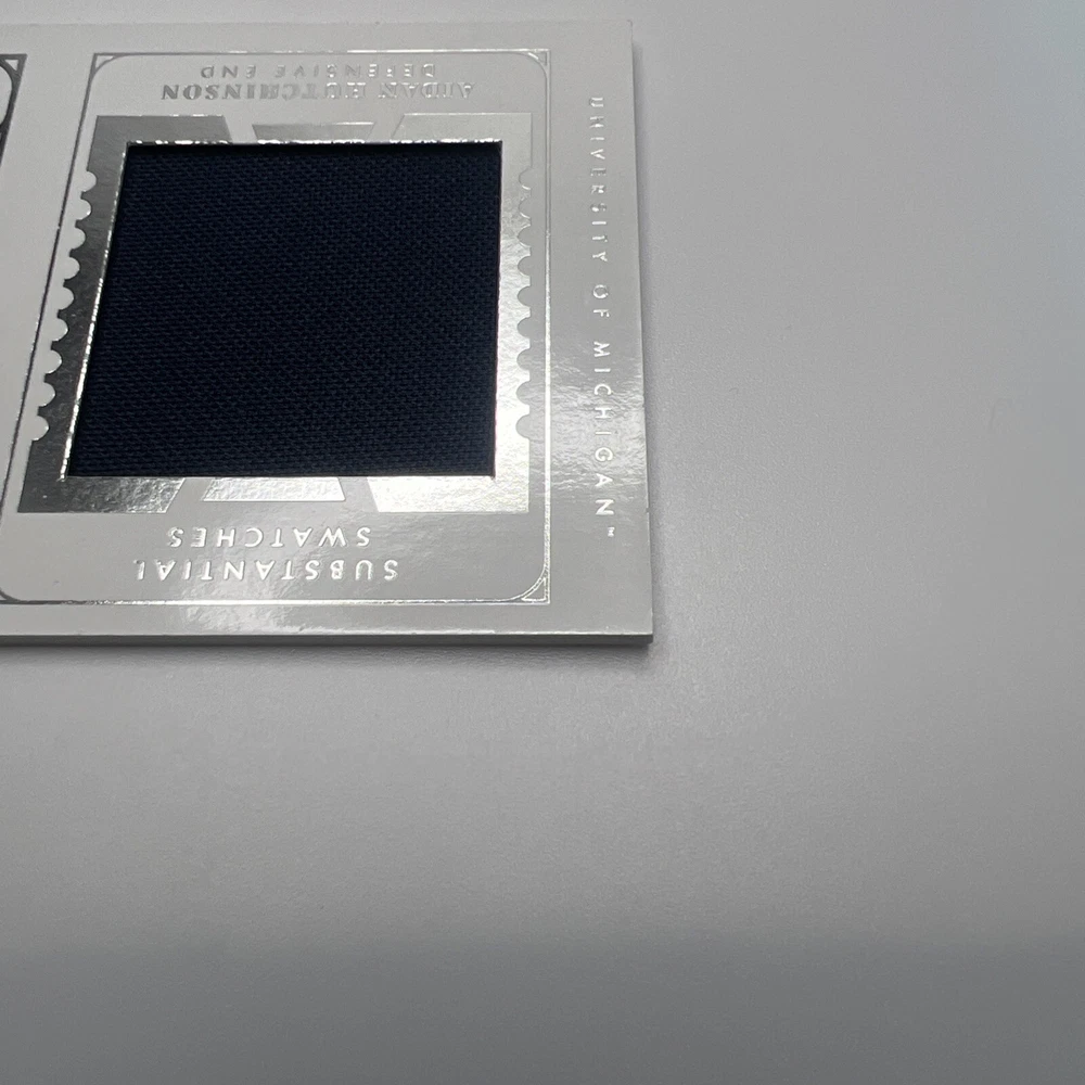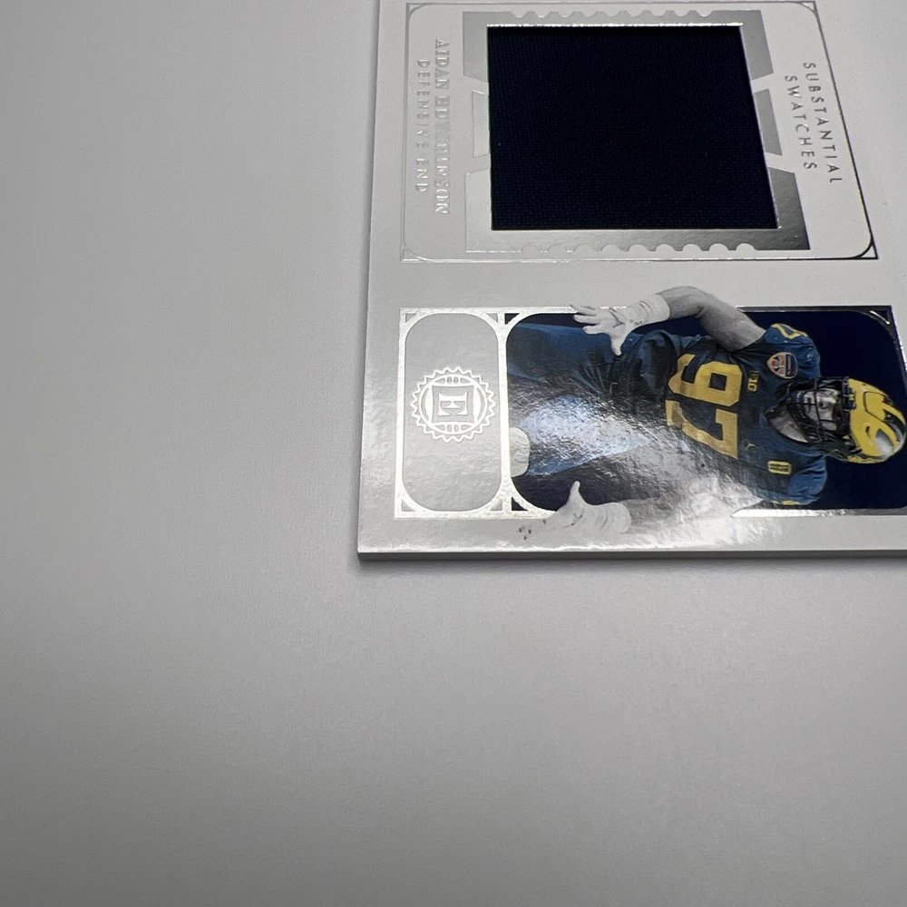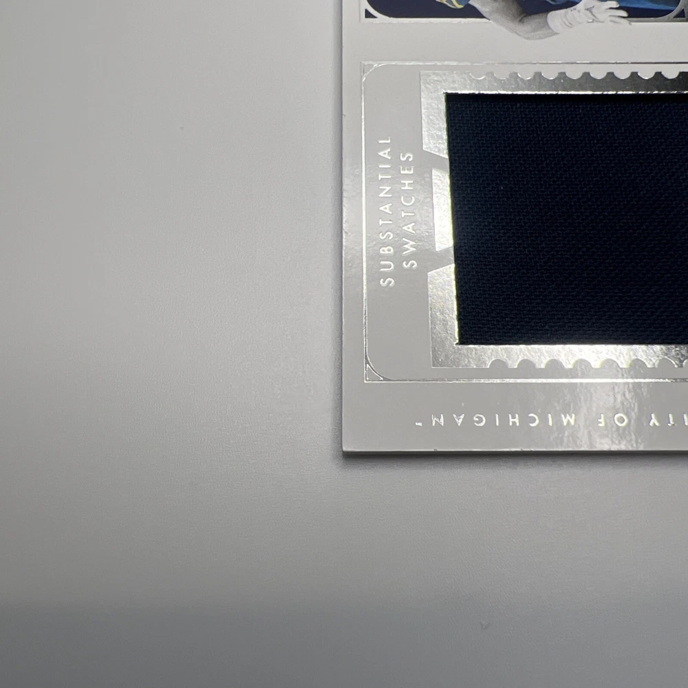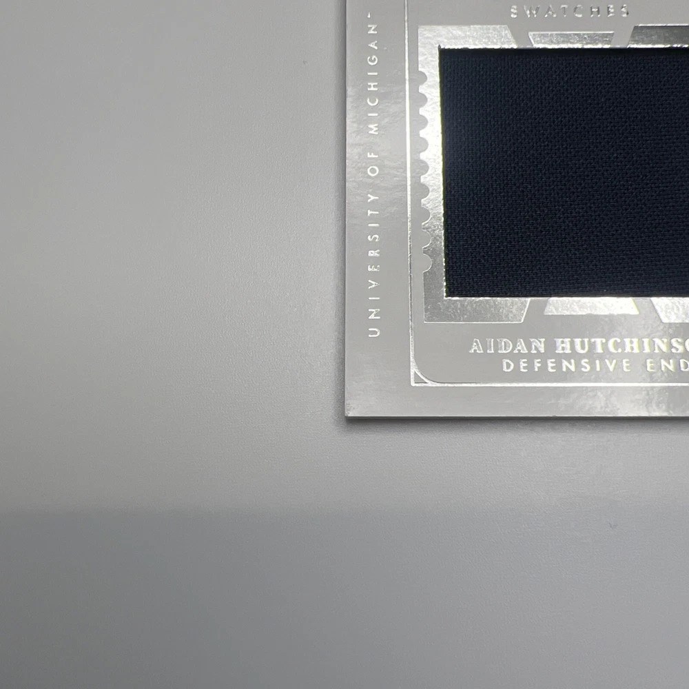 The 2022 Panini Chronicles Draft Picks Encased Substantial Swatches card features Aidan Hutchinson, a player from the Michigan Wolverines football team. This sports trading card is part of the National Collegiate Athletic Association (NCAA) league and manufactured by Panini in 2022. The card includes a piece of jersey material embedded in the card stock, making it a memorabilia card with Patch and SP (short print) features, as well as being encased for protection and collectibility. This particular card is an insert in the set, showcasing Hutchinson as a rookie player for fans and collectors to enjoy.