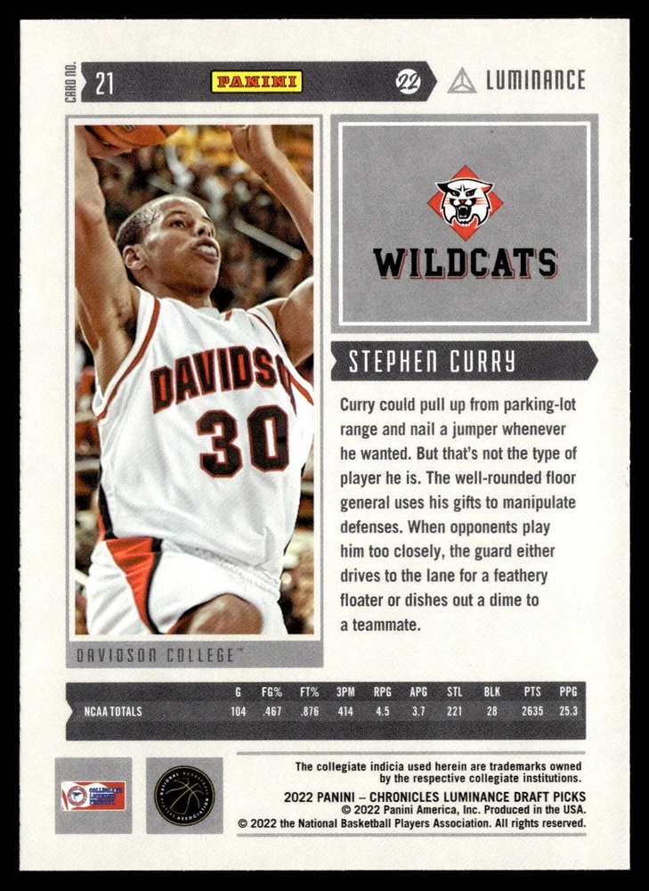 The Card pictured is the card you will receive unless there are multiple quantities then you will receive a card in the comparable grade. Cards in poor condition could have creasing, stains, rounded corners, pen marks or a combo of them. please see pics for a better understanding of cards condition. Excellent Davidson Wildcats Luminance Stephen Curry #21 2022 Panini Chronicles Draft Picks Panini 2022 Basketball .
