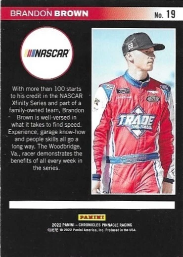 This 2022 Panini Chronicles Pinnacle Blue trading card features athlete Brandon Brown of TradetheChain. The serial-numbered card is an original product from Panini America, Inc. and is a single-insert card from the 2022 season. The card number is 19 and it is part of the blue parallel/variety set. This sports trading card is perfect for avid collectors and fans of racing.