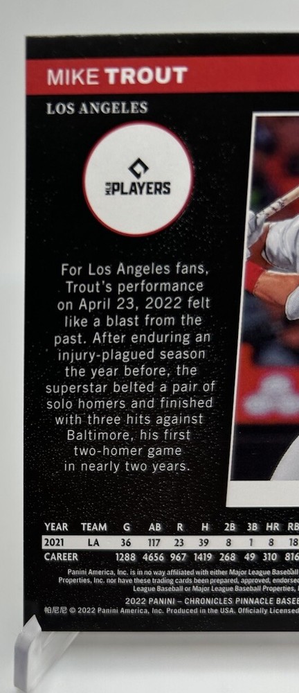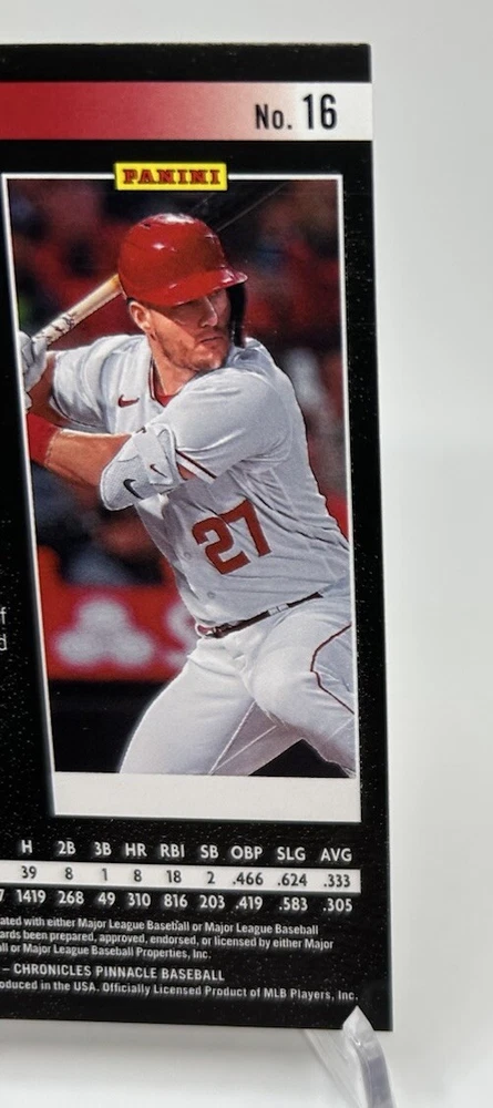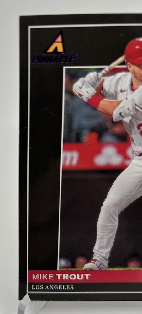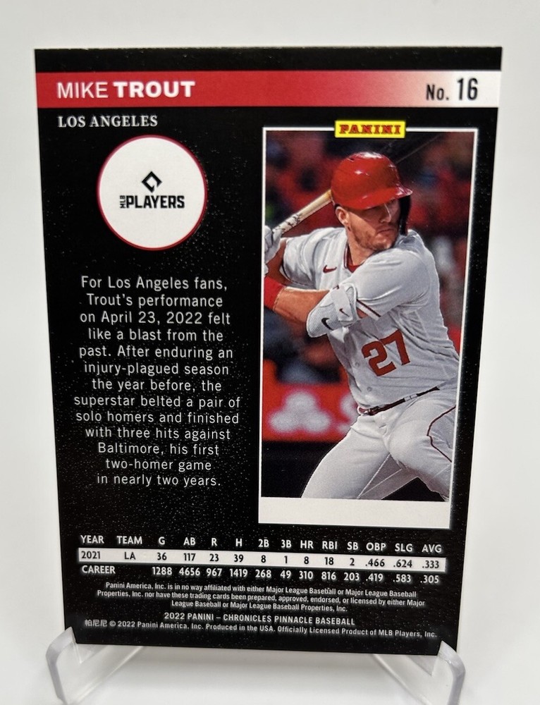 A 2022 Panini Chronicles Pinnacle trading card featuring Mike Trout of the Los Angeles Angels. This limited edition card has a print run of 23 out of 25 and is a Black parallel variety. It is an original card made of card stock and is part of the Major League Baseball (MLB) series. The card is in NM-MT condition and is an exclusive insert in the set. Excellent Surface / Excellent Color / (4) Sharp Corners / Great Opportunity To Own A “ Low Numbered “ Mike Trout 23/25 , Only (24) Other Cards Exist! 🔥. Carefully Packaged / Fully Insured / Shipped Via USPS Priority Mail With Tracking Number Provided / Smoke Free Home!