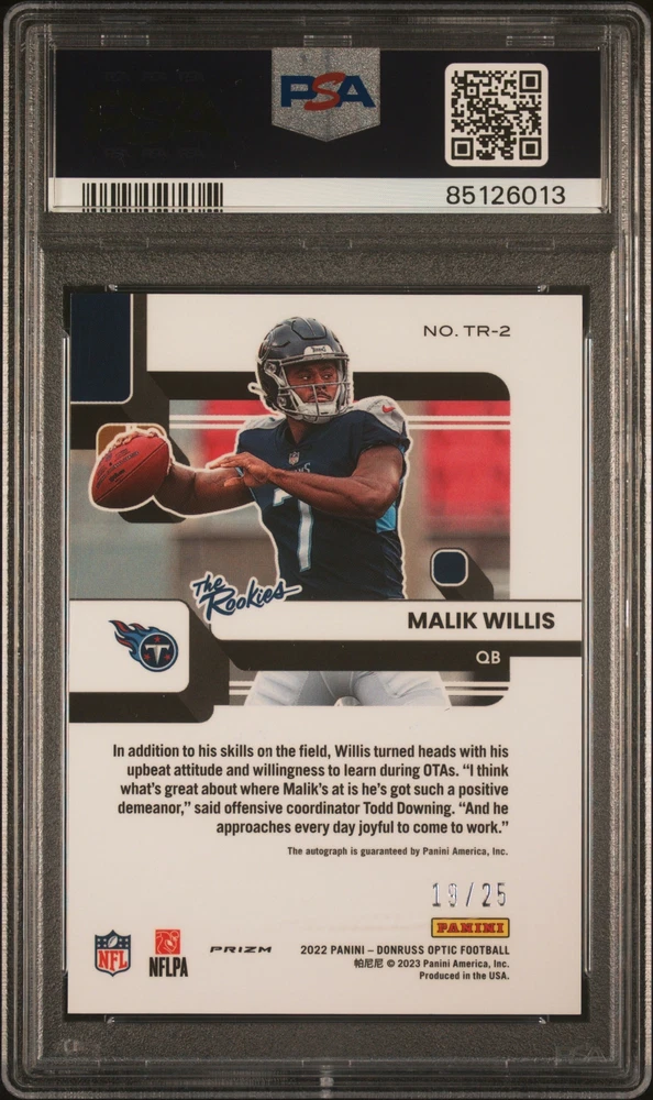 You are purchasing a 2022 Panini Donruss Optic The Rookies Malik Willis #TR2 The Rookies Purple Stars PSA 10. You will receive the exact item in the photographs. Thank you for looking. Listed With Mascot .
